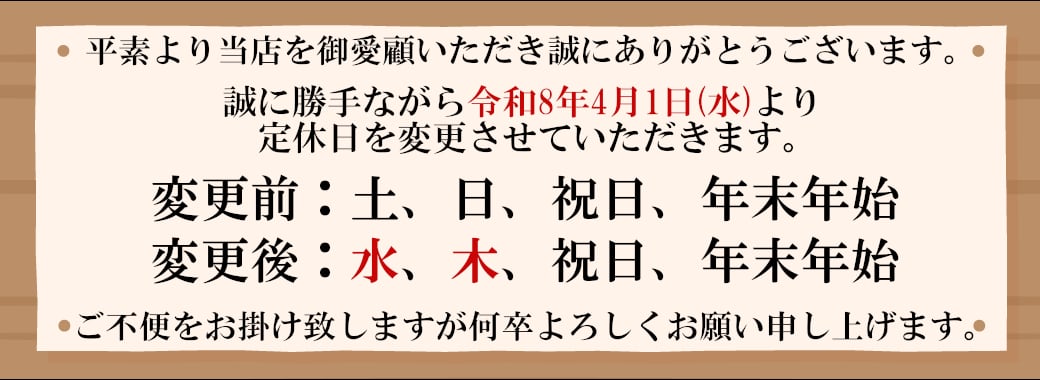 平素より当店を御愛顧いただき誠にありがとうございます。 誠に勝手ながら令和8年4月1日(水)より定休日を変更させていただきます。 変更前:土、日、祝日、年末年始 ↓ 変更後:水、木、祝日、年末年始 ※営業時間及びお問い合わせ対応時間に変更はございません。 ご不便をおかけしますが、ご理解のほどよろしくお願い申し上げます。