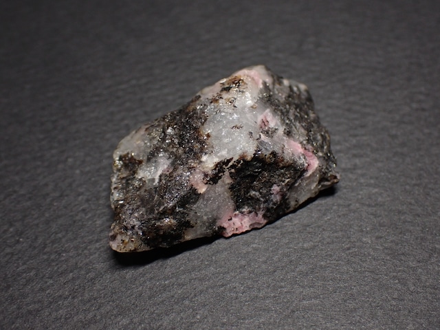 サイズ…40x24x13mm 重さ…11.9g 産地…Madagascar(マダガスカル) 水晶の中にピンク色のロードナイト(薔薇輝石)と黒いマンガンと思われる鉱物が内包されております。