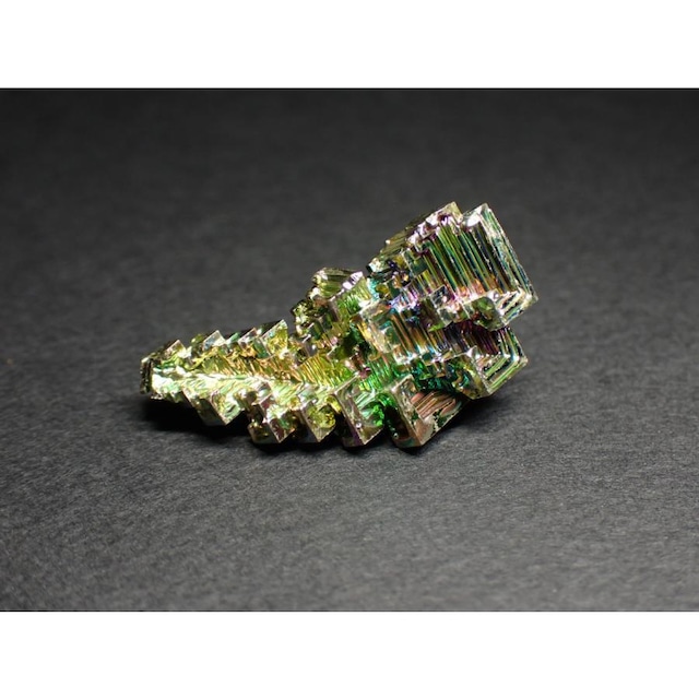 サイズ…28x44x33mm 重さ…50.6g 産地…Germany(ドイツ) ビスマスを熱で溶かして再結晶させた人工結晶です。 結晶の形は骸晶になっており、表面は酸化膜により虹色に輝きます。