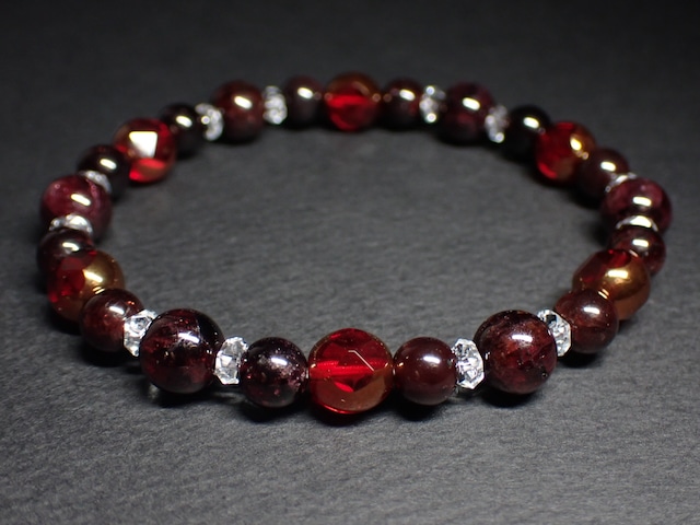 店主がはるか昔、ハンドメイド天然石ブレスレットを販売していた頃の在庫が発見されました。 話し合った結果、今は自分で店をやってるんだしお店に出してみようとなりました。 ビーズの数に限りはありますが、作れるだけ作ってみますので是非ご覧ください。 サイズ(内径)…約17cm 使用ゴム糸…オペロンゴム糸約0.6mm2重通し 使用天然石…ガーネット8mmx6個 ガーネット6mmx12個 カット水晶2mmx12個 ガラスビーズx6個 ※ご注意※ こちらのブレスレットは1点ものになりますので、サイズ変更が出来ない旨予めご了承ください。 身に着ける際に勢いよくしますと割れてしまう場合が御座いますのでご注意ください。