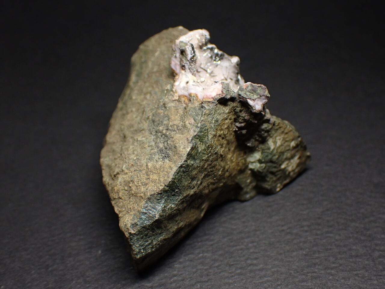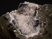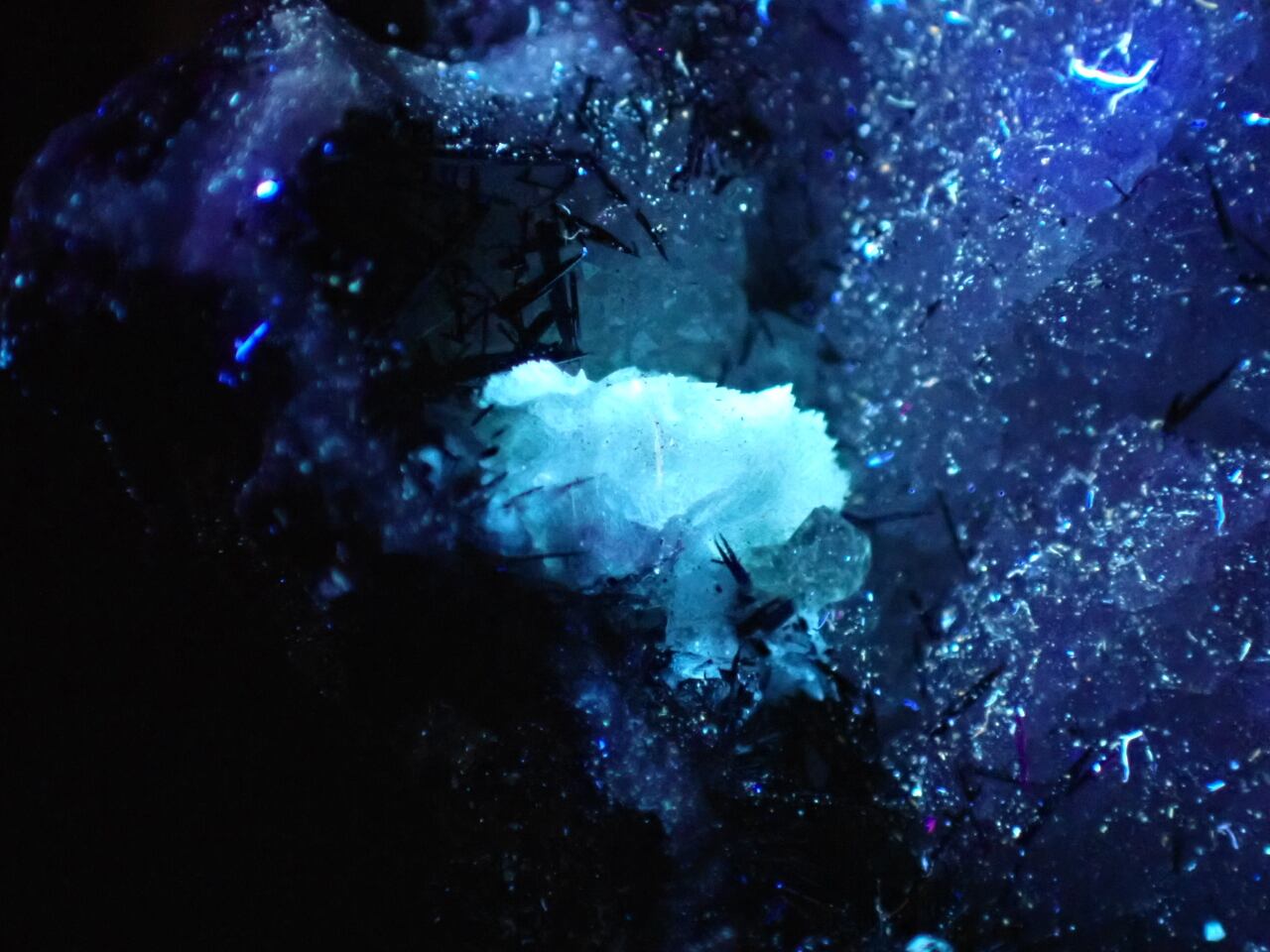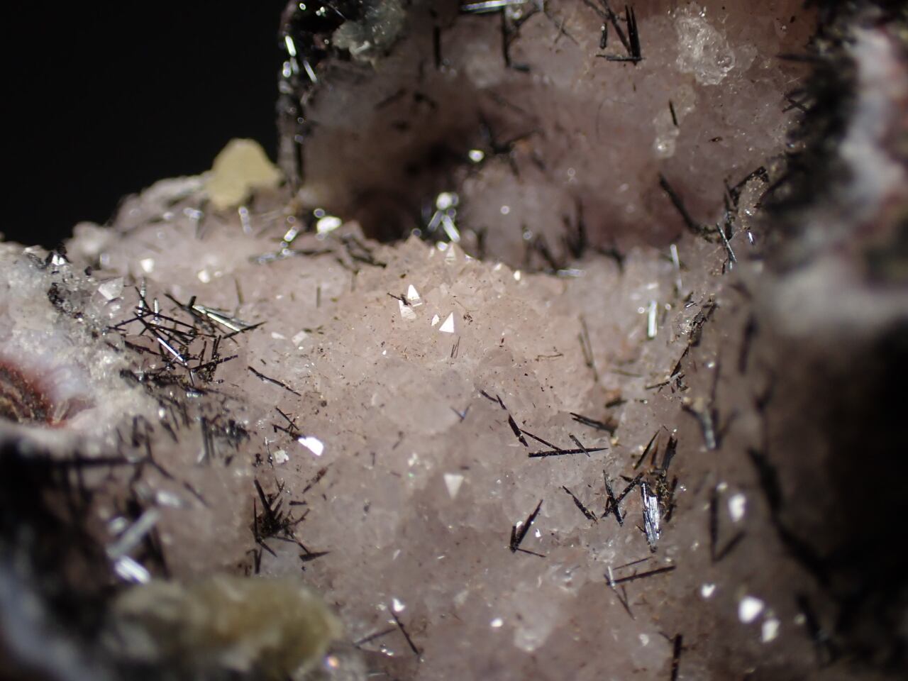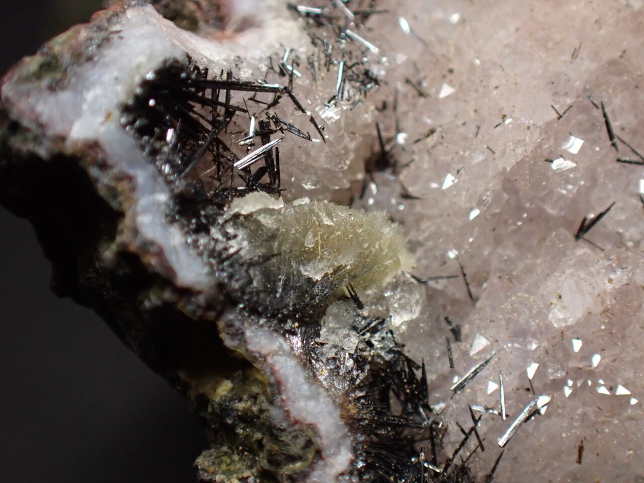 こちらはジオードの水晶上や水晶内に結晶しており、カルサイト(方解石)も確認できます。