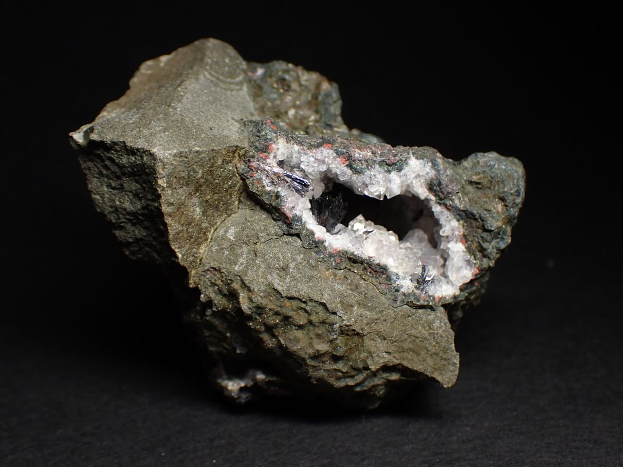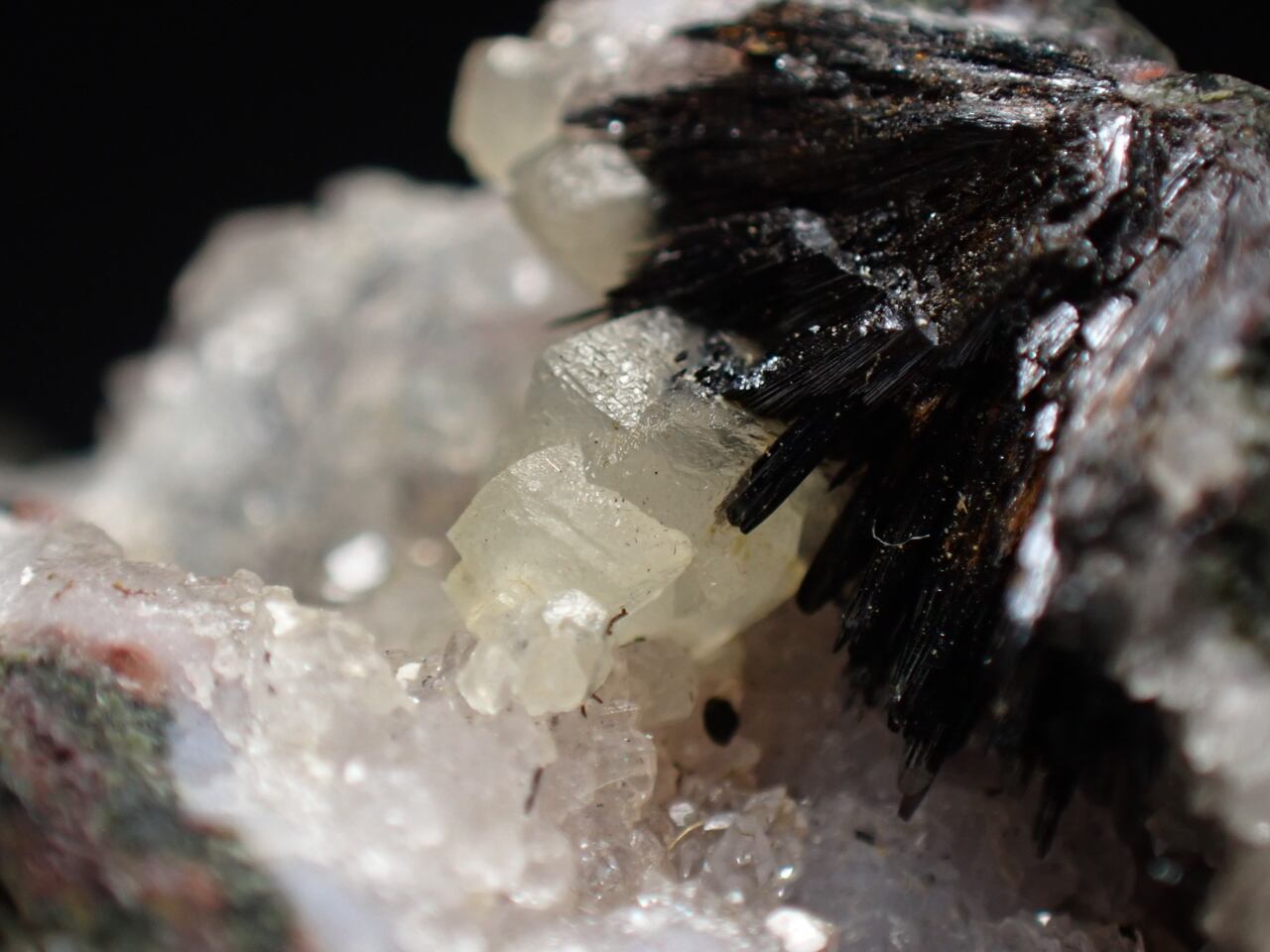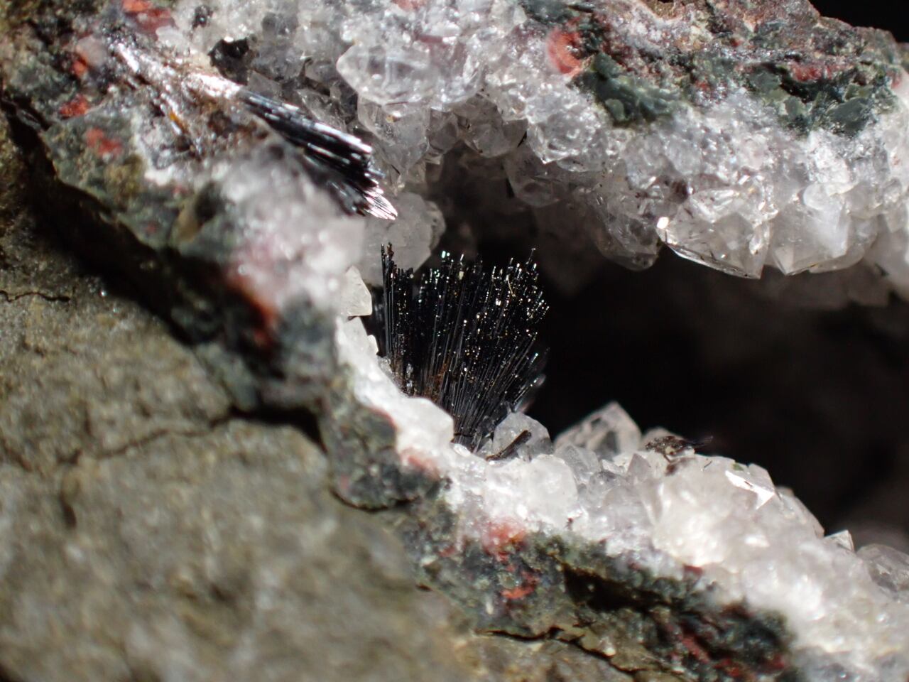 こちらはジオードの水晶上や水晶内に結晶しており、カルサイト(方解石)も確認できます。