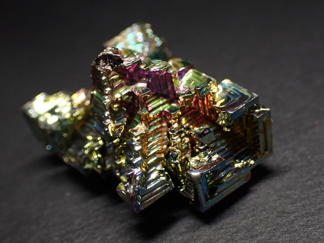 結晶の形は骸晶になっており、表面は酸化膜により虹色に輝きます。