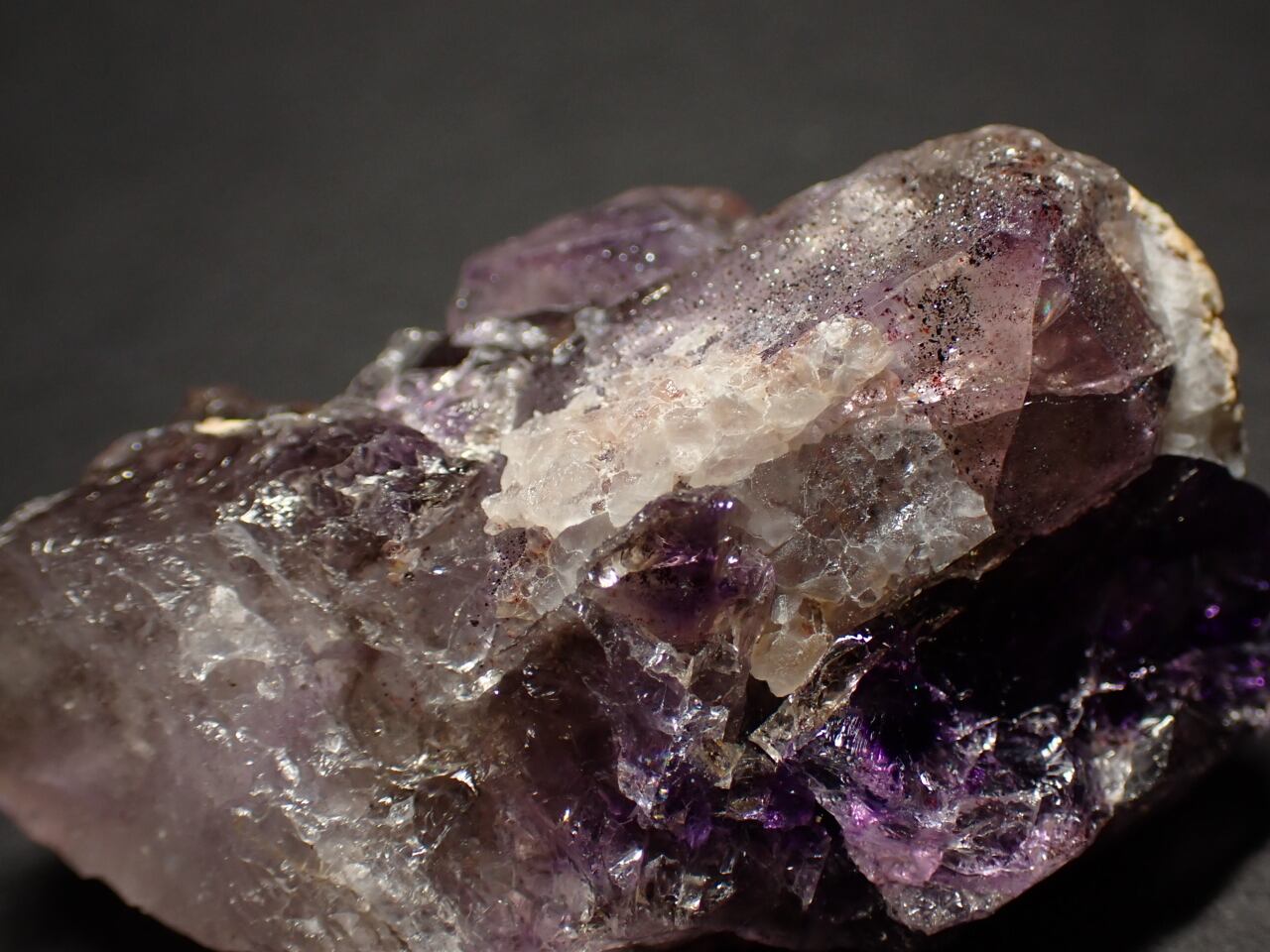 多くはスモーキーアメジストでエレスチャルやセプターのような形状をしており、レピドクロサイトやゲーサイト等が内包されていることが多い観察のしがいのあるアメジストとなっております。