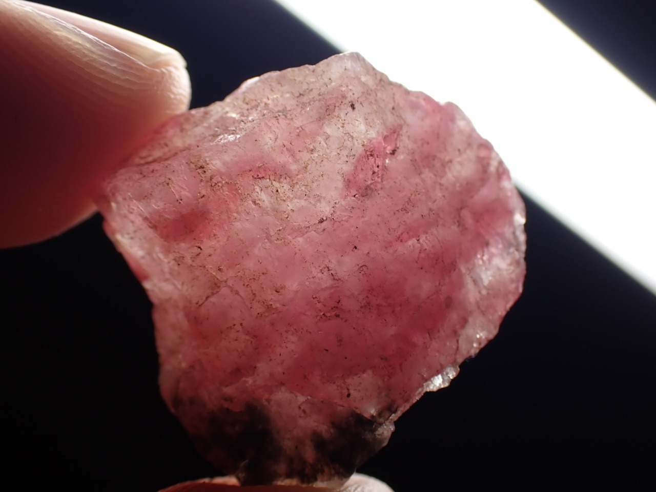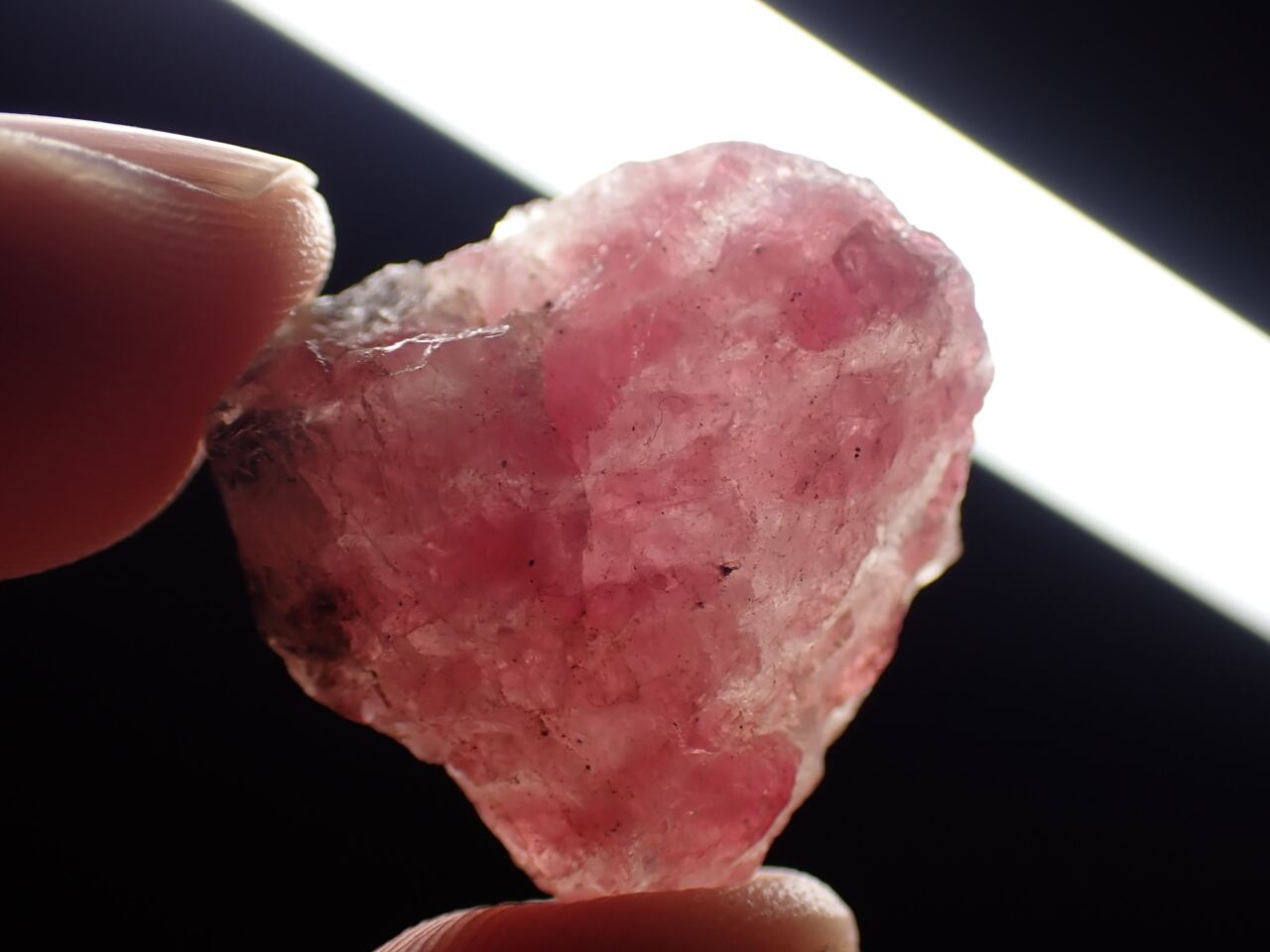 水晶の中にピンク色のロードナイト(薔薇輝石)と酸化したマンガンと思われる黒い成分が内包されております。