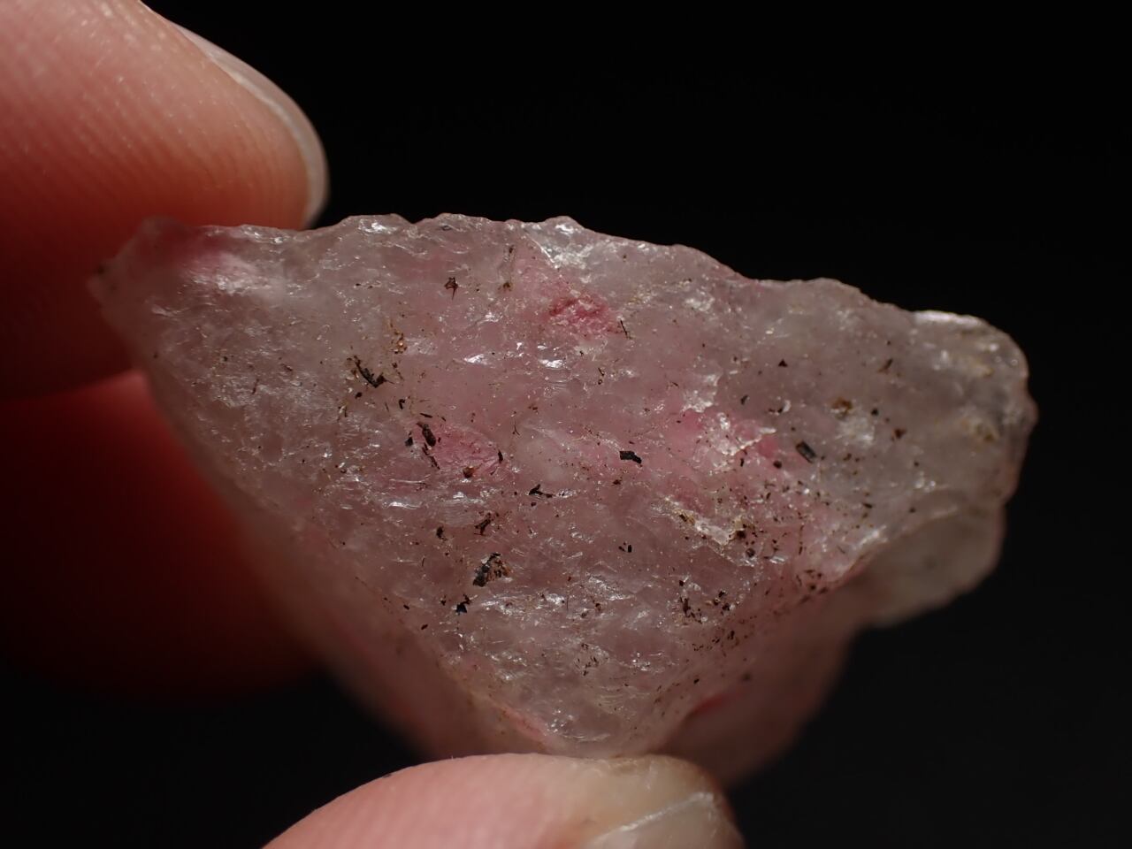 水晶の中にピンク色のロードナイト(薔薇輝石)が内包されております。