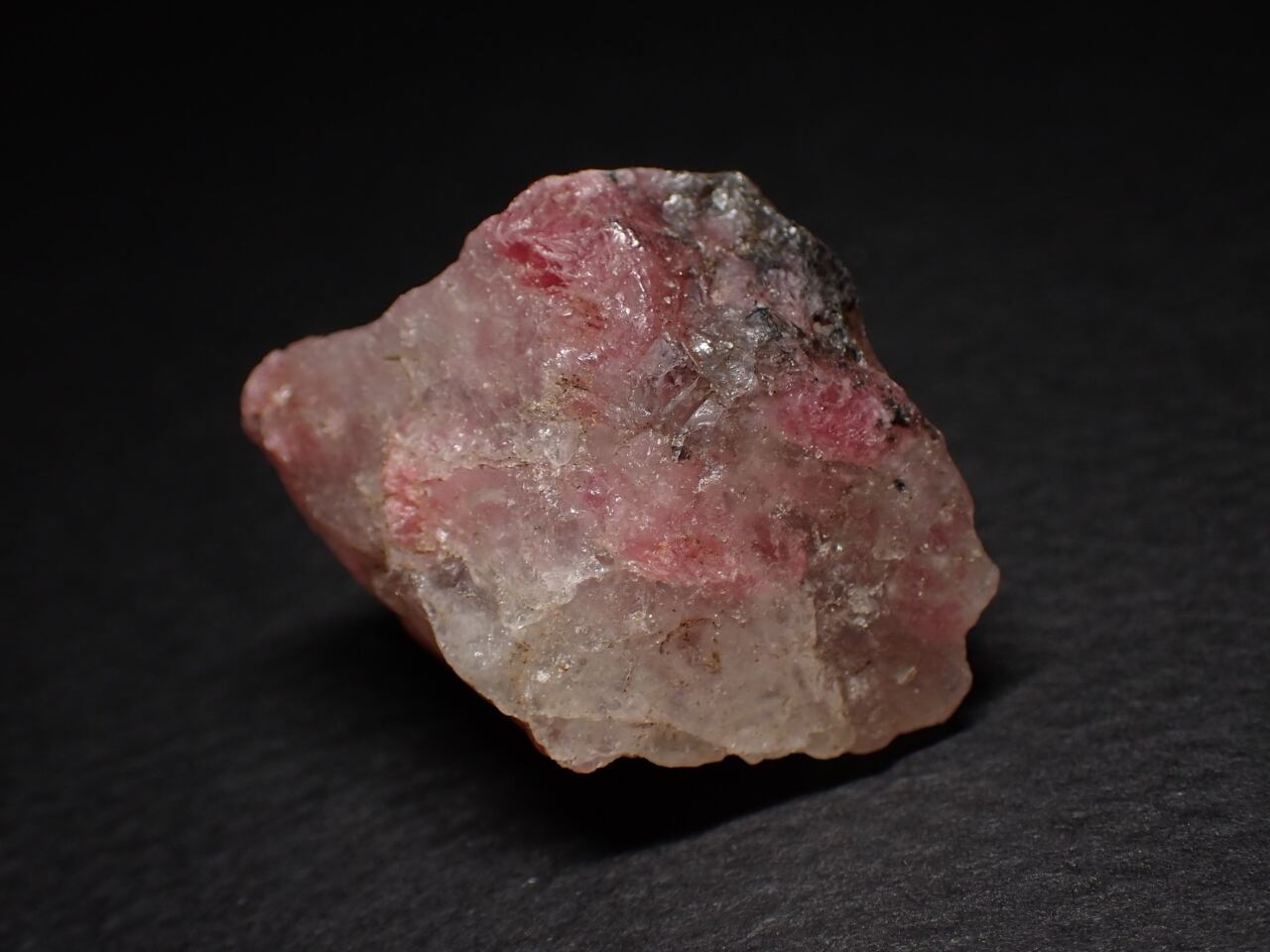 水晶の中にピンク色のロードナイト(薔薇輝石)と酸化したマンガンと思われる黒い成分が内包されております。