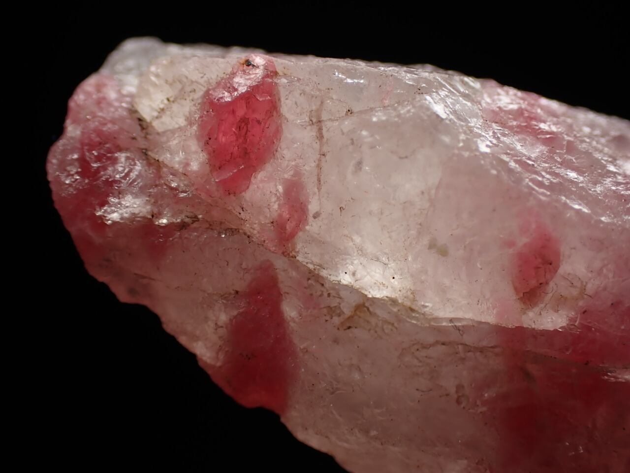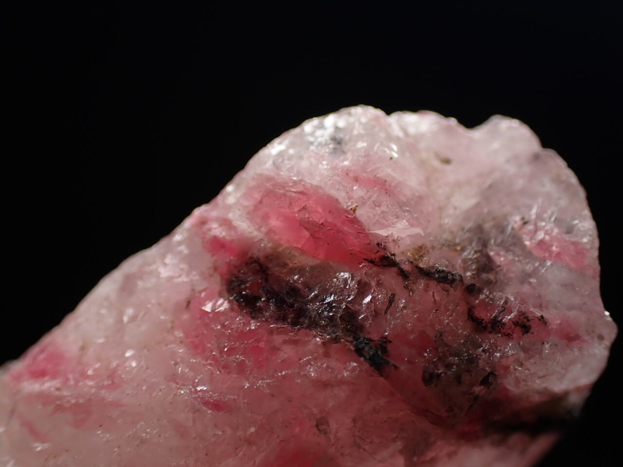 水晶の中にピンク色のロードナイト(薔薇輝石)と酸化したマンガンと思われる黒い成分が内包されております。