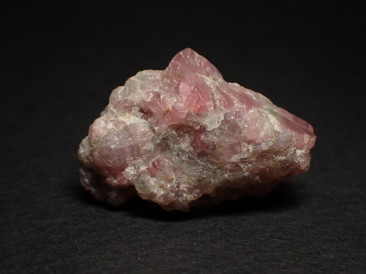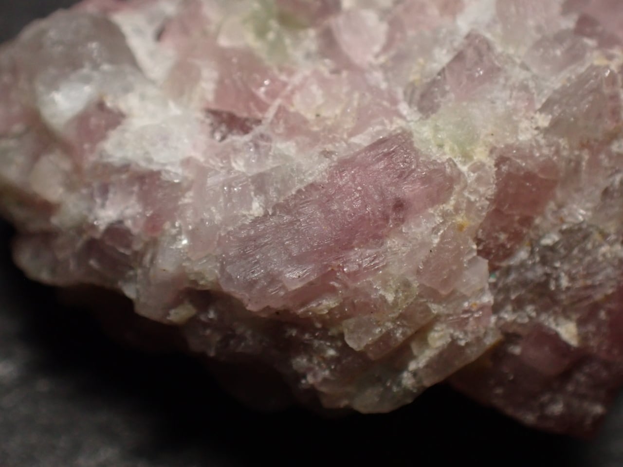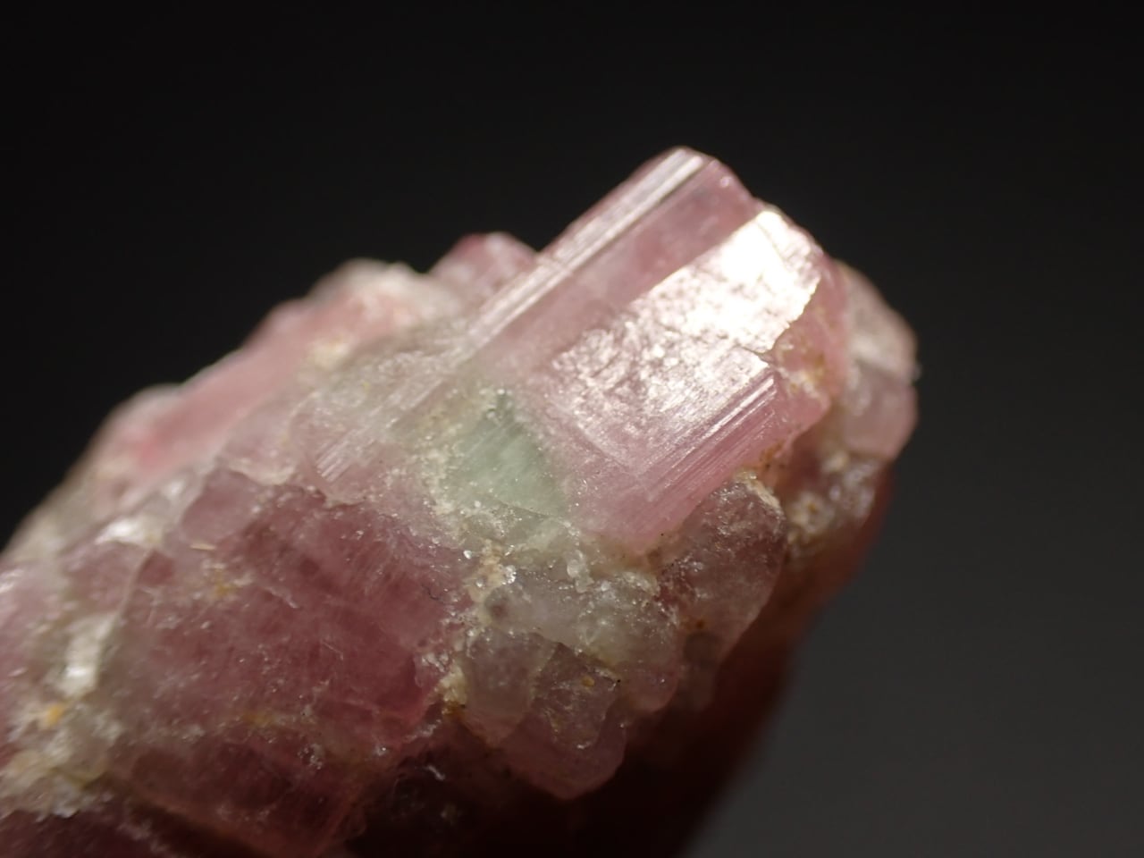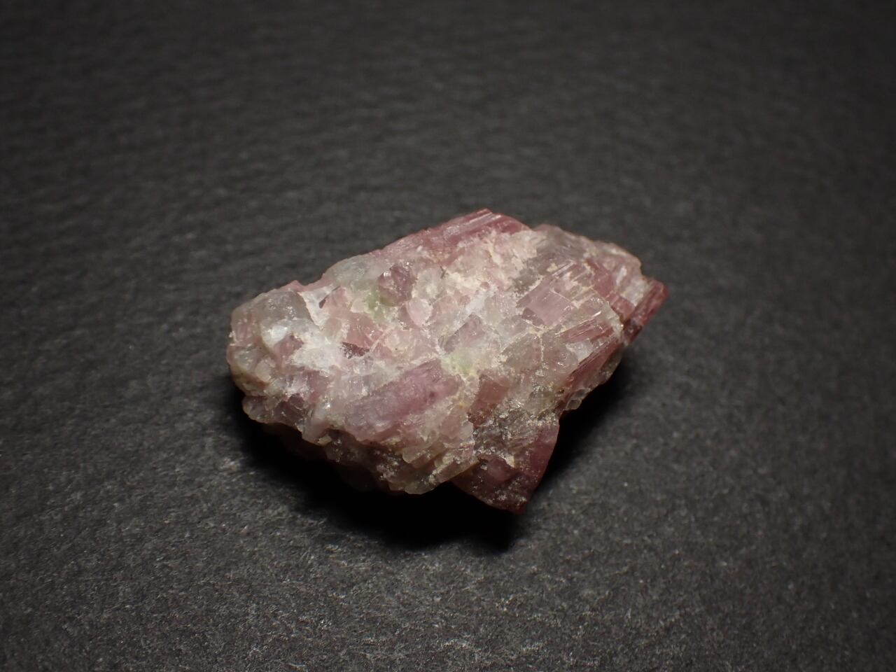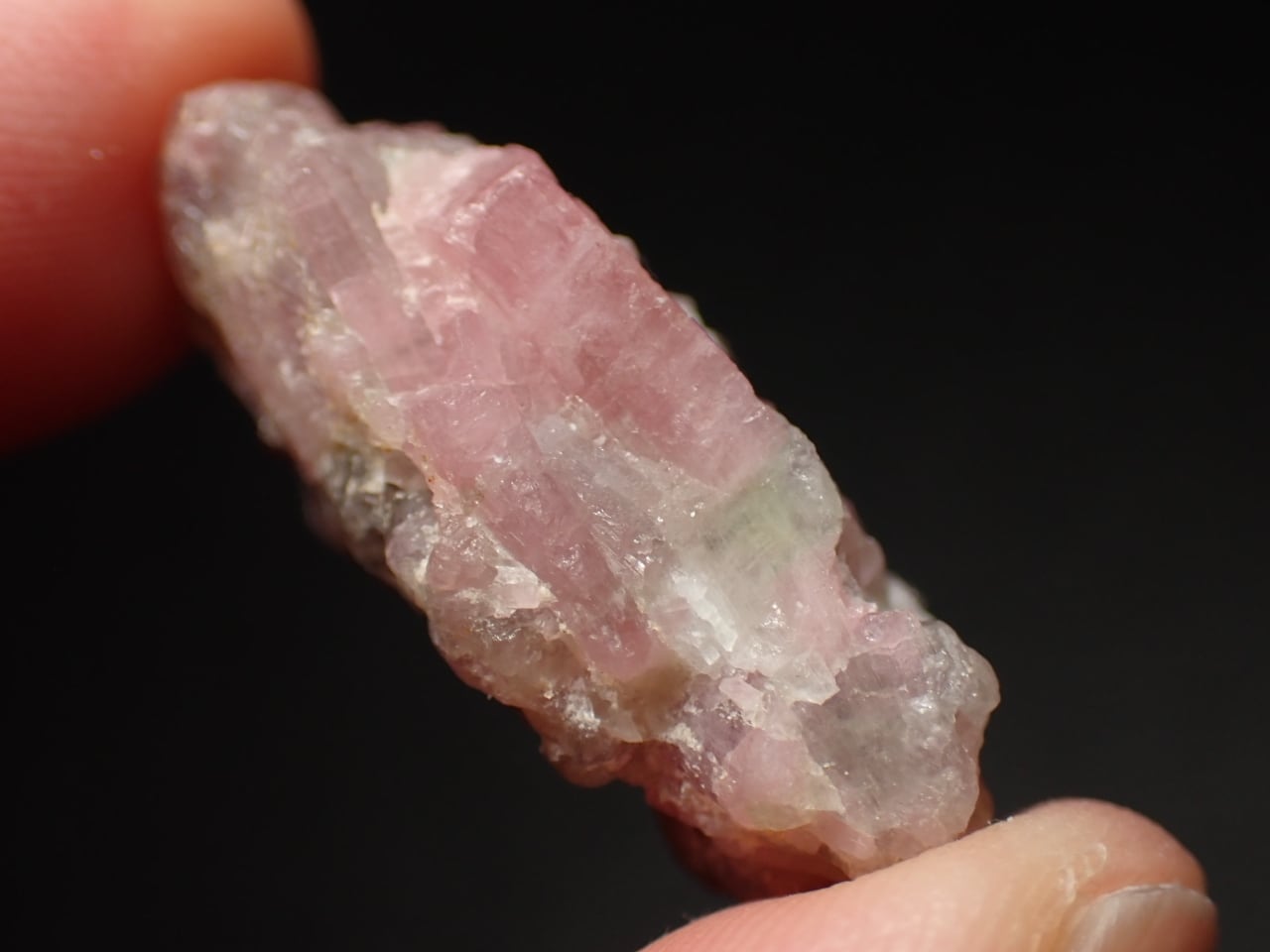 ピンク色の部分と薄い緑色の部分があるエルバイト結晶の塊です。