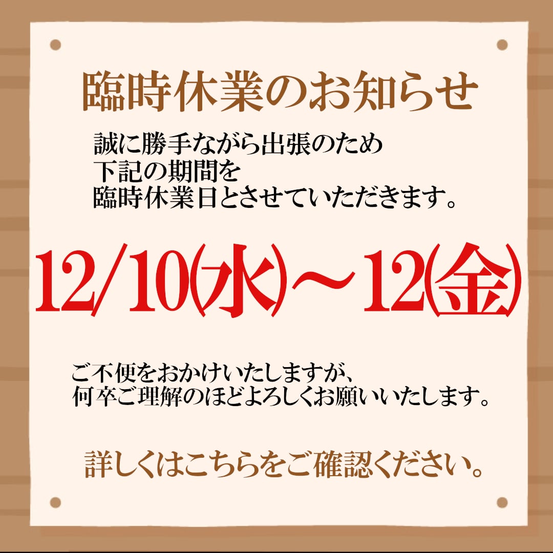 誠に勝手ながら出張のため、12/10(水)~12(金)を臨時休業日とさせていただきます。