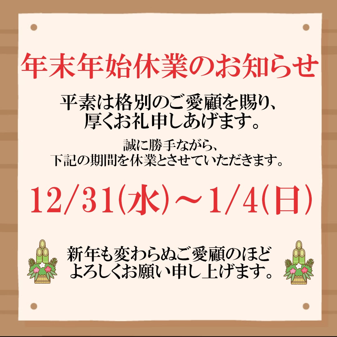 誠に勝手ながら、12/31(水)~1/4(日)を年末年始休業とさせていただきます。