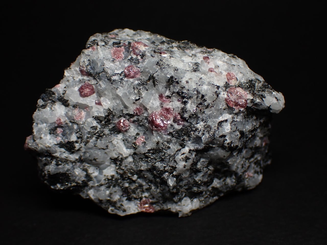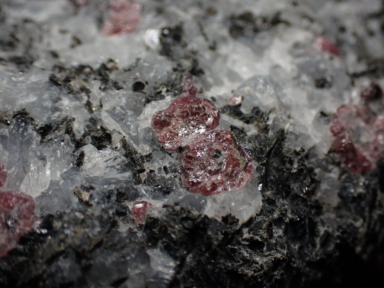 母岩に含まれるルビーではない赤い鉱物はおそらくユーディアライトと思われます。