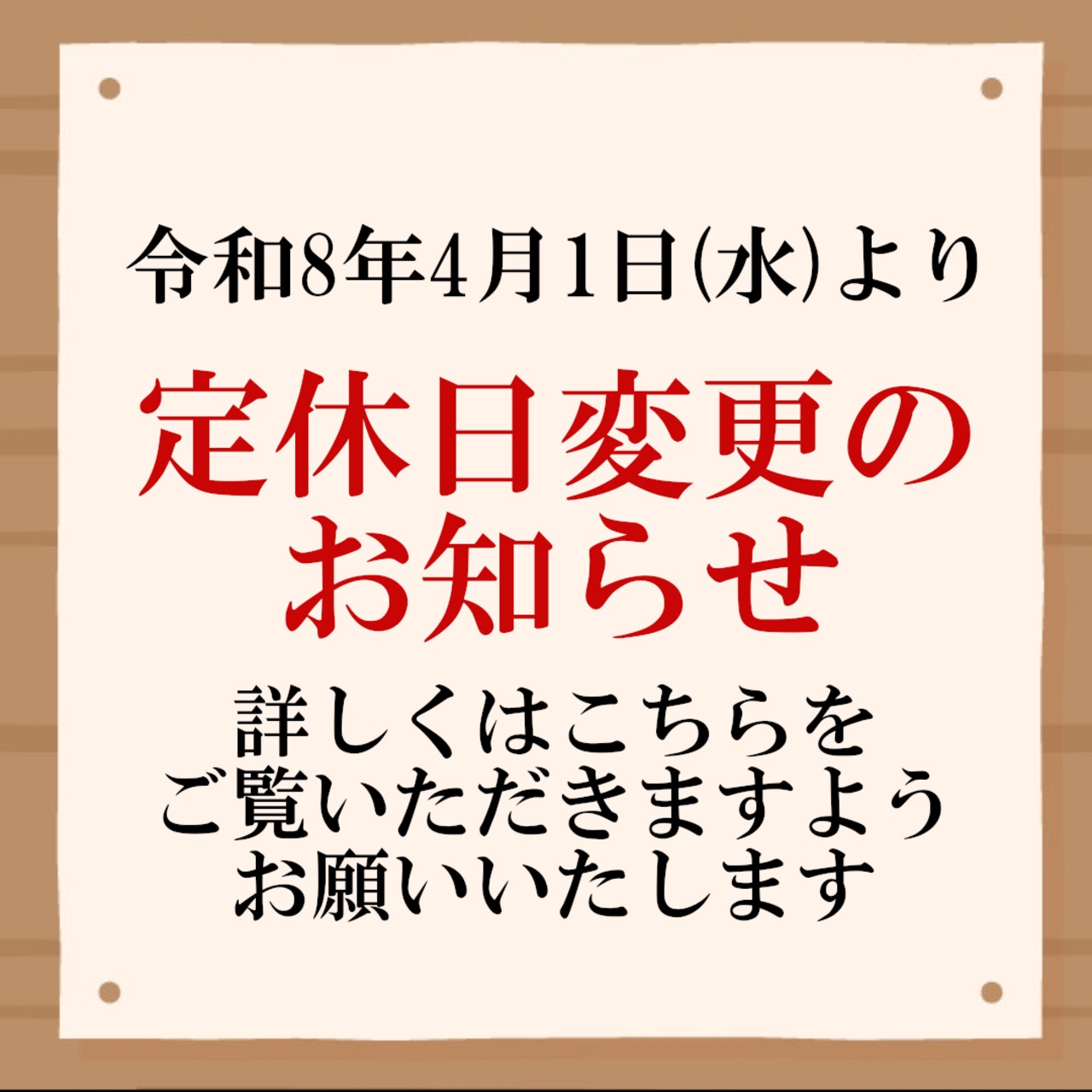 誠に勝手ながら令和8年4月1日(水)より定休日を変更させていただきます。