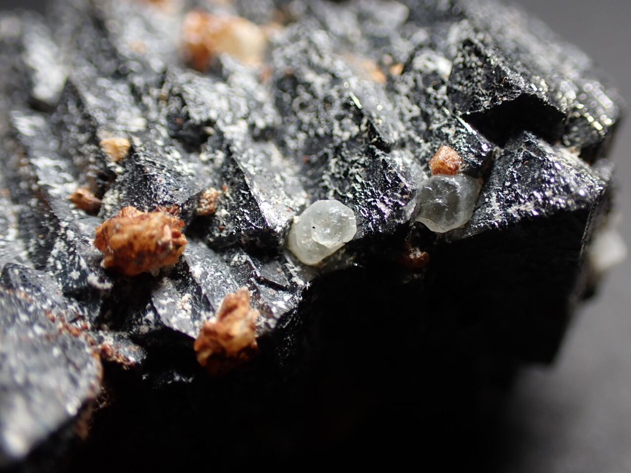 こちらはオレンジ色のシデライト(菱鉄鉱)と白色のアパタイト(燐灰石)が共生しております。
