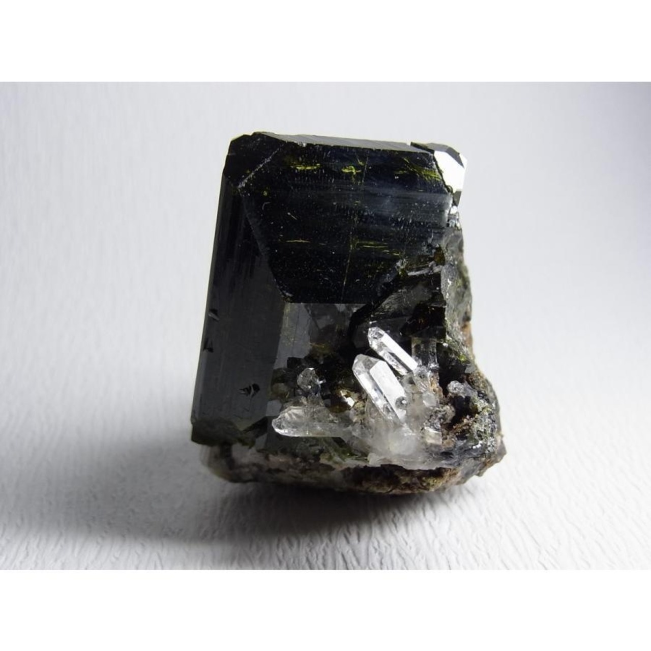 先端にクラックがありますが、大型の結晶で水晶の共生もあり見ごたえのある標本です。