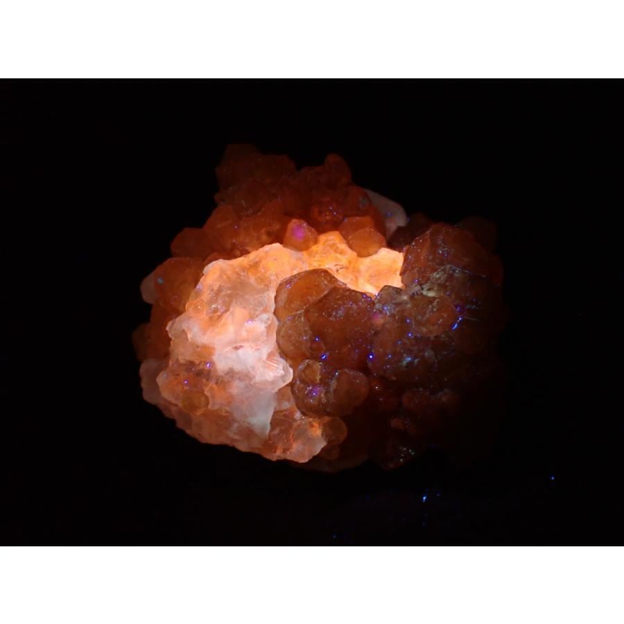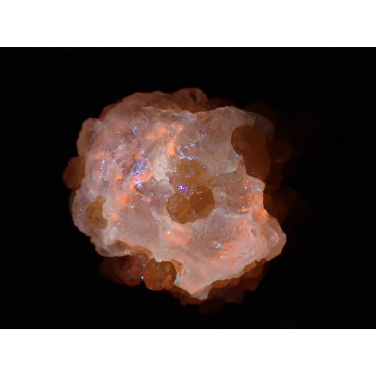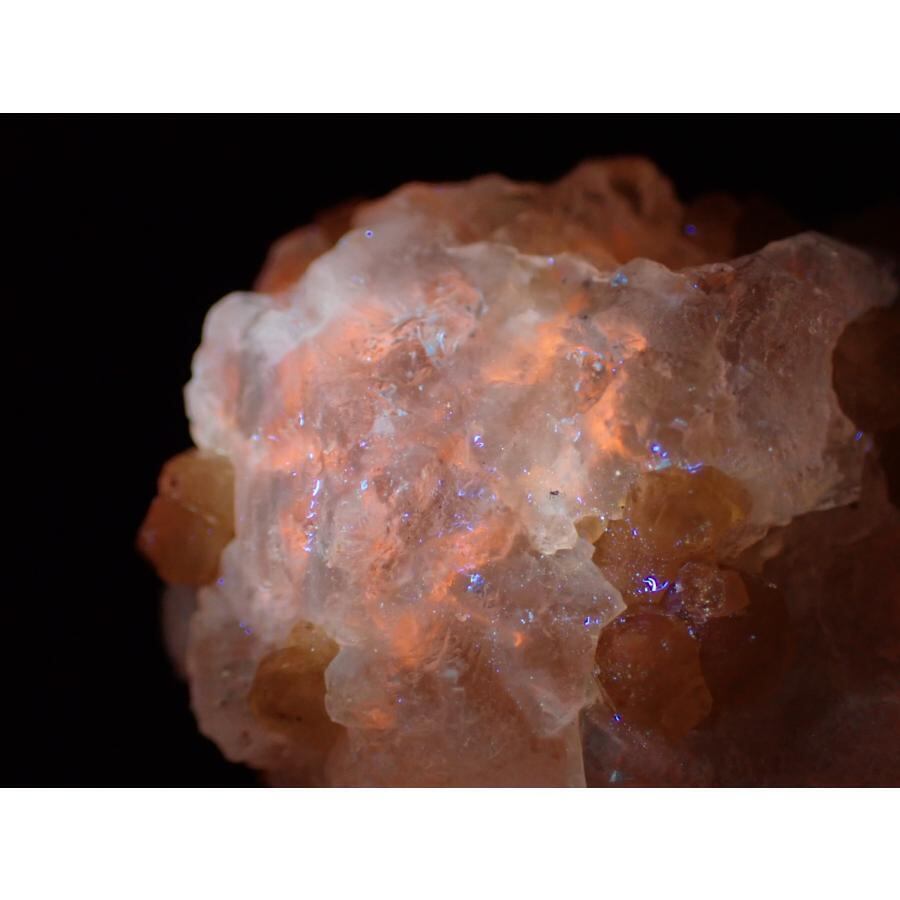 恐らくカルサイト(方解石)と思われる鉱物の蛍光が確認できます。