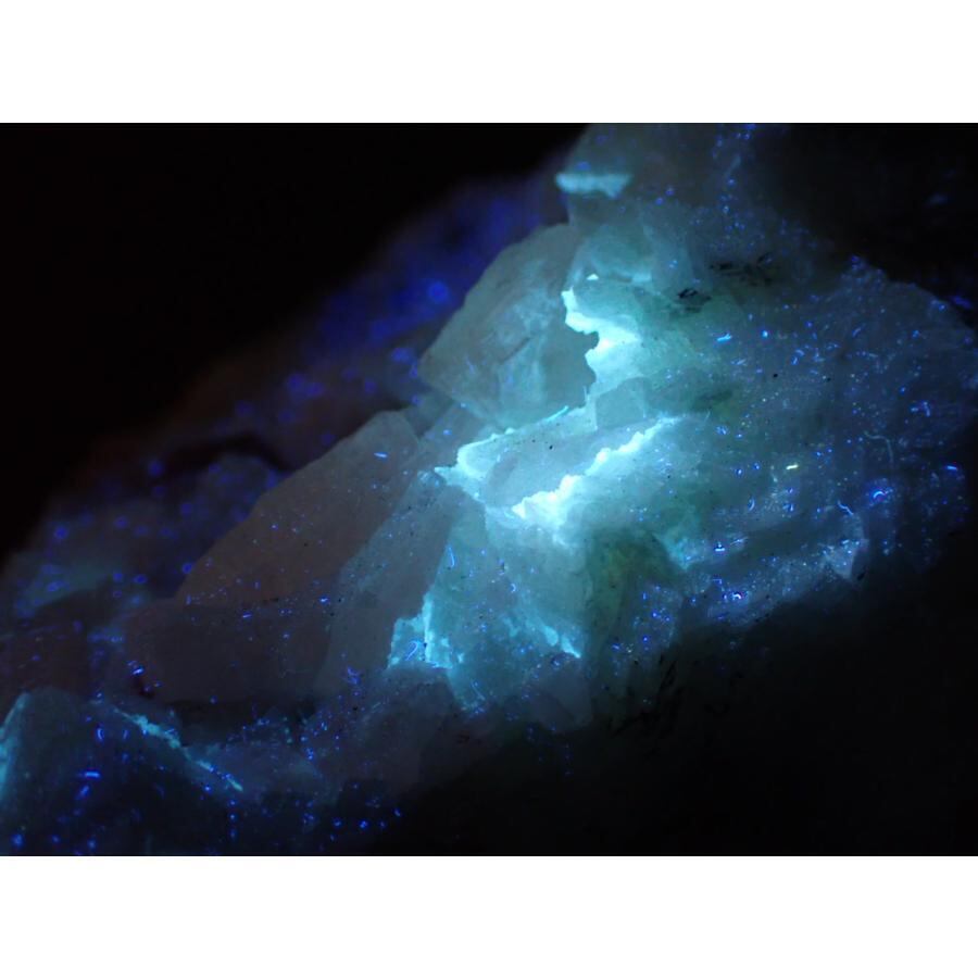 ハイパーUVライトで照らしたところ、カルサイト(方解石)と思われる鉱物の蛍光(薄いピンク)と、蛍光と燐光が確認出来る箇所がありました。