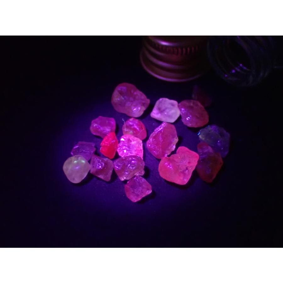 蛍光の写真一枚目は一般的なブラックライト(長波紫外線ライト)、二枚目は強力な紫外線ライト(紫外線波長 365nm)を使用しております。