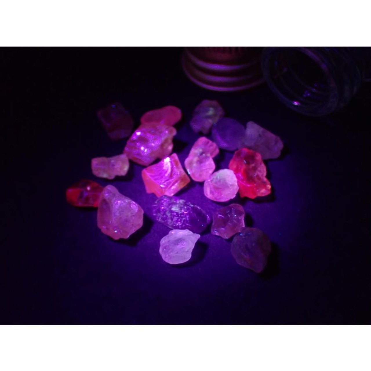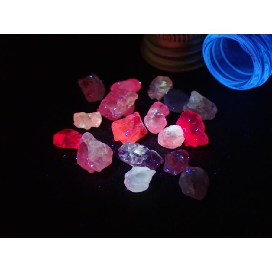 蛍光の写真一枚目は一般的なブラックライト(長波紫外線ライト)、二枚目は強力な紫外線ライト(紫外線波長 365nm)を使用しております。