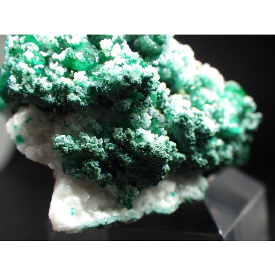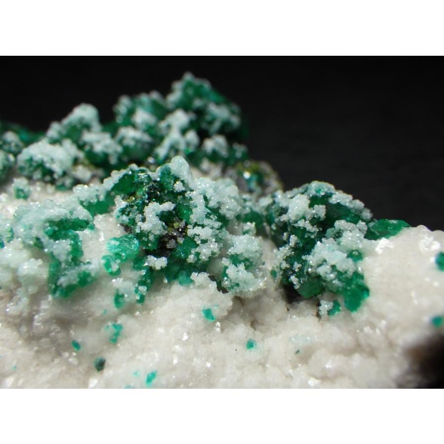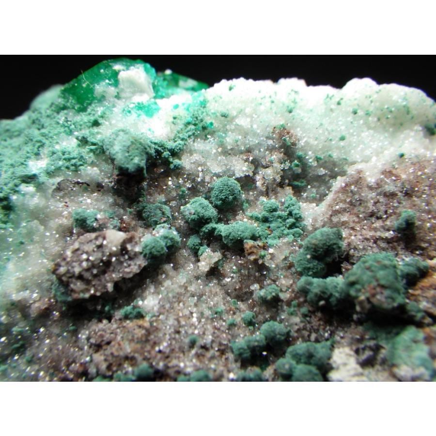 こちらは、ダイオプテーズ(翠銅鉱)の表面などにカルサイト(方解石)とマラカイト(孔雀石)の共生が確認できます。