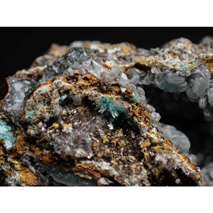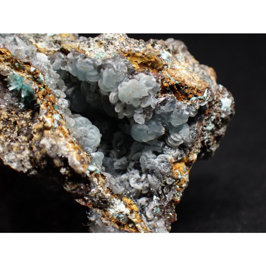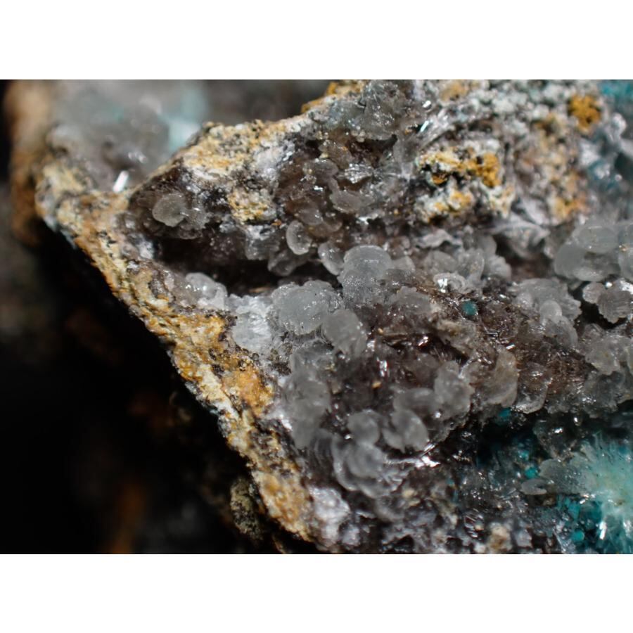 こちらのヘミモルファイトwithオーリチャルサイト(水亜鉛銅鉱)は、オーリチャルサイト部分と母岩が脆くなっております。