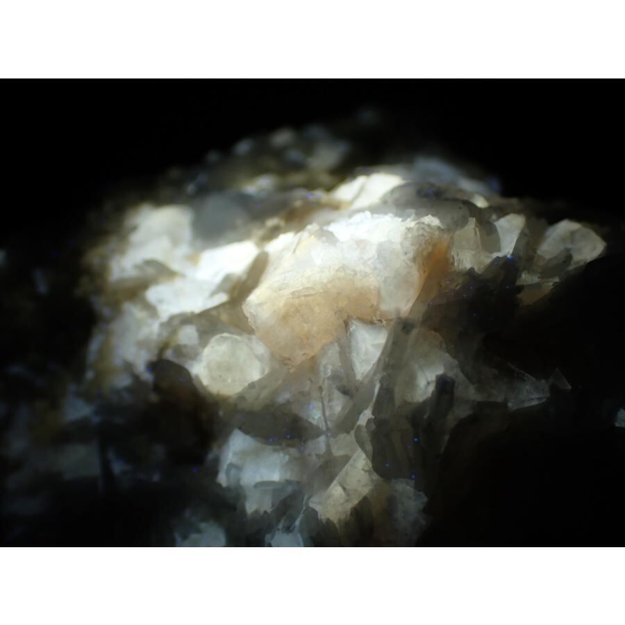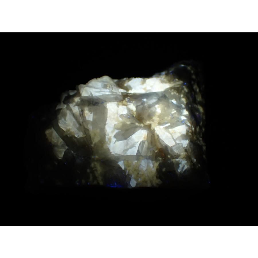 薄い水色の鉱物がセレスタイト(天青石)、蛍光を示す鉱物がフローライト(蛍石)です。