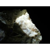 薄い水色の鉱物がセレスタイト(天青石)、蛍光を示す鉱物がフローライト(蛍石)です。
