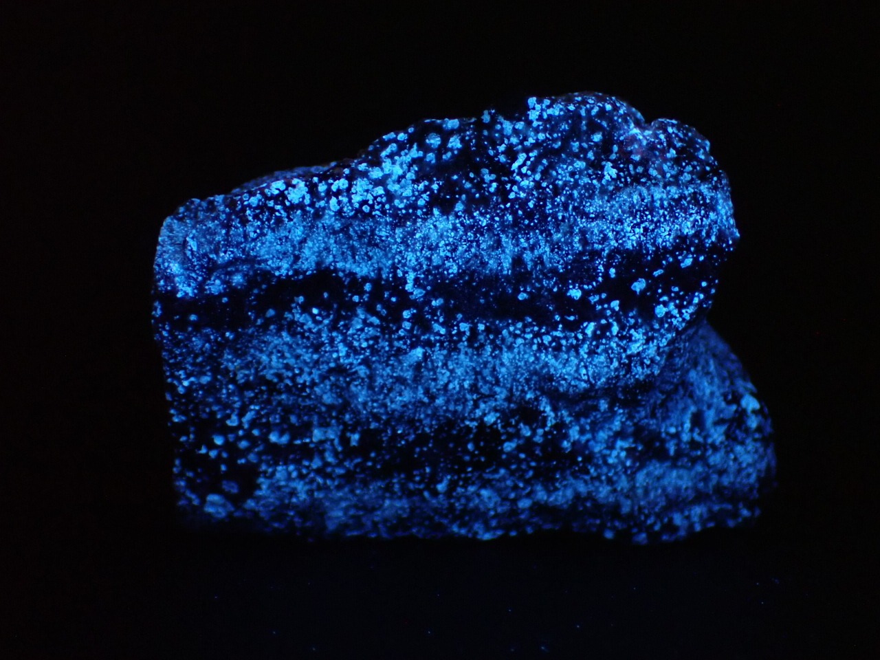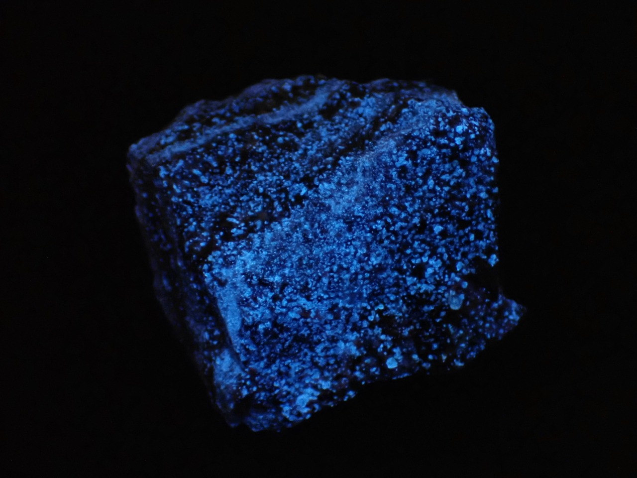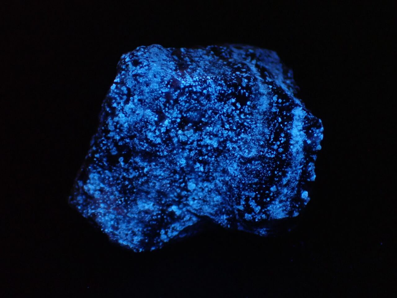 灰重石(Scheelite)は短波紫外線ライトで照らすと青白く蛍光します。