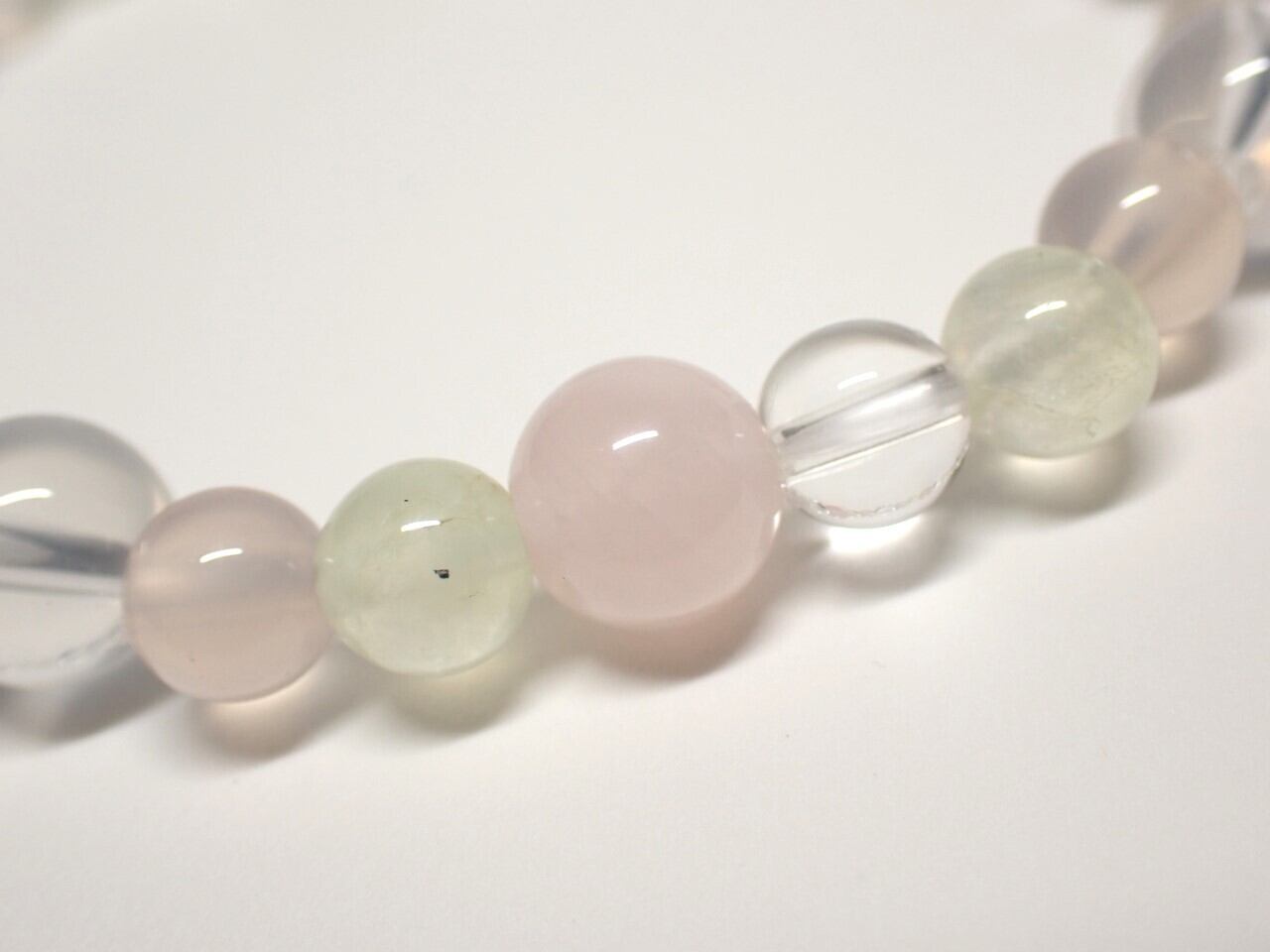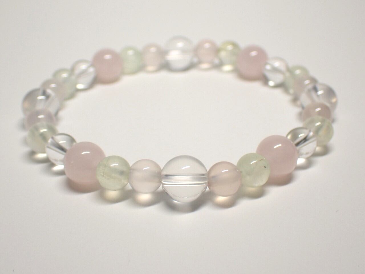 使用天然石…ローズクォーツ8mmx4個 ミルキークォーツ8mmx4個 プレナイト6mmx8個 ピンクカルセドニー6mmx8個 水晶6mmx4個