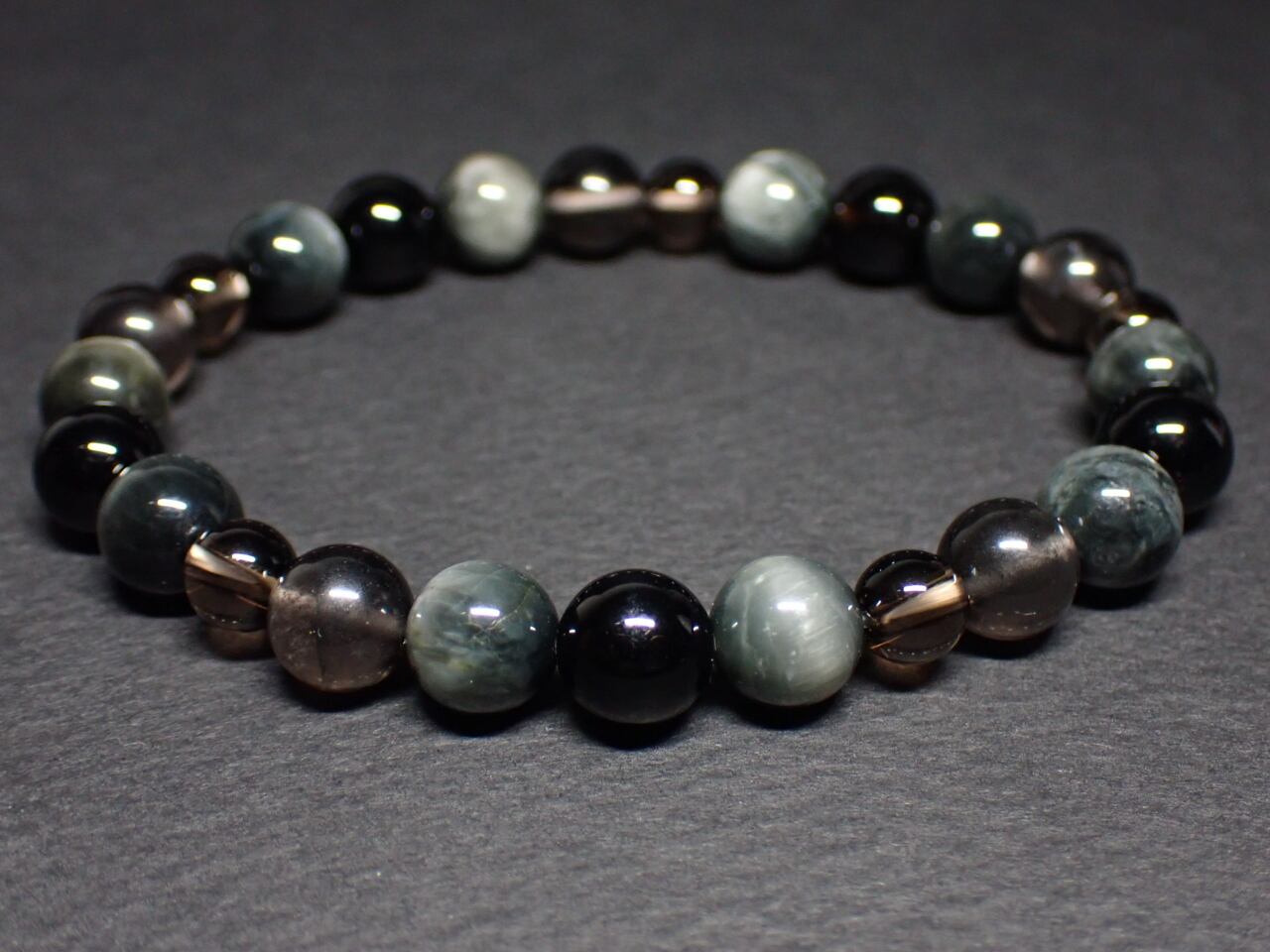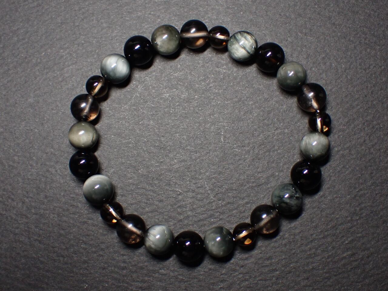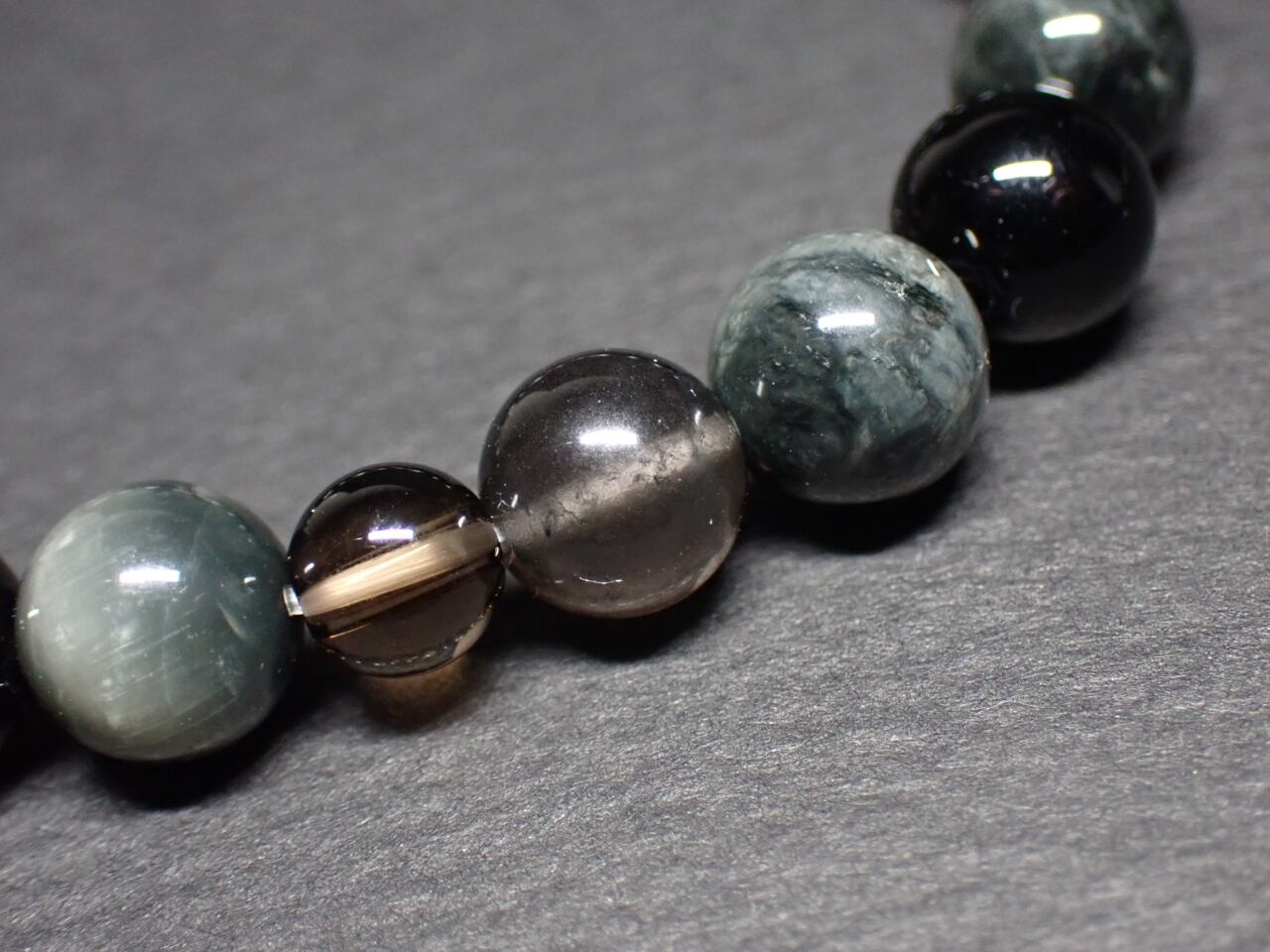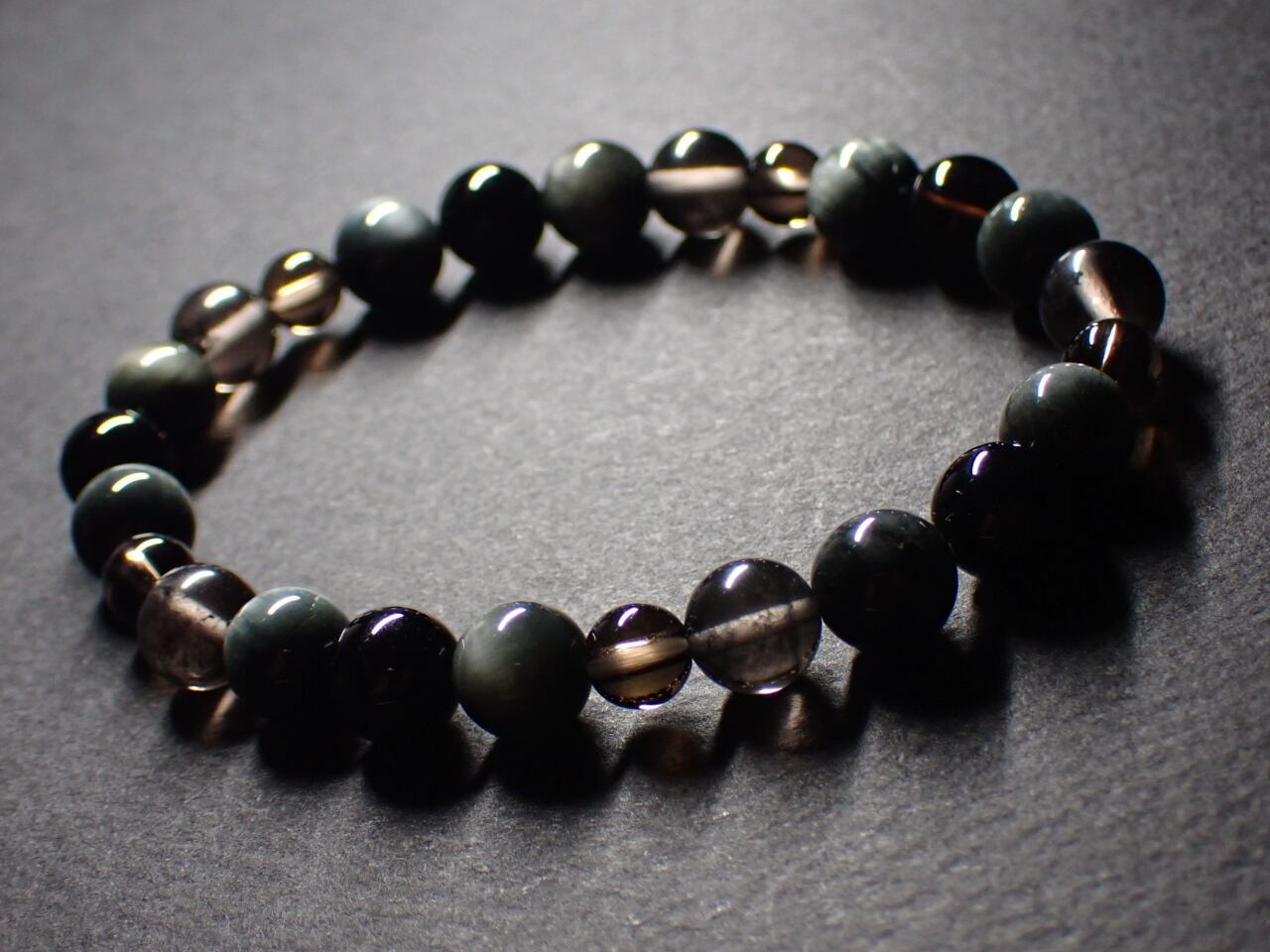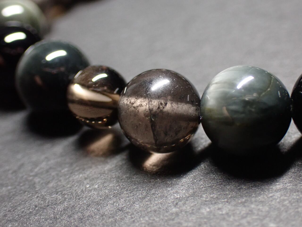 使用天然石…イーグルアイ8mmx10個 ロシア産モリオン8mmx5個 スモーキーオブシディアン8mmx5個 スモーキークォーツ6mmx5個