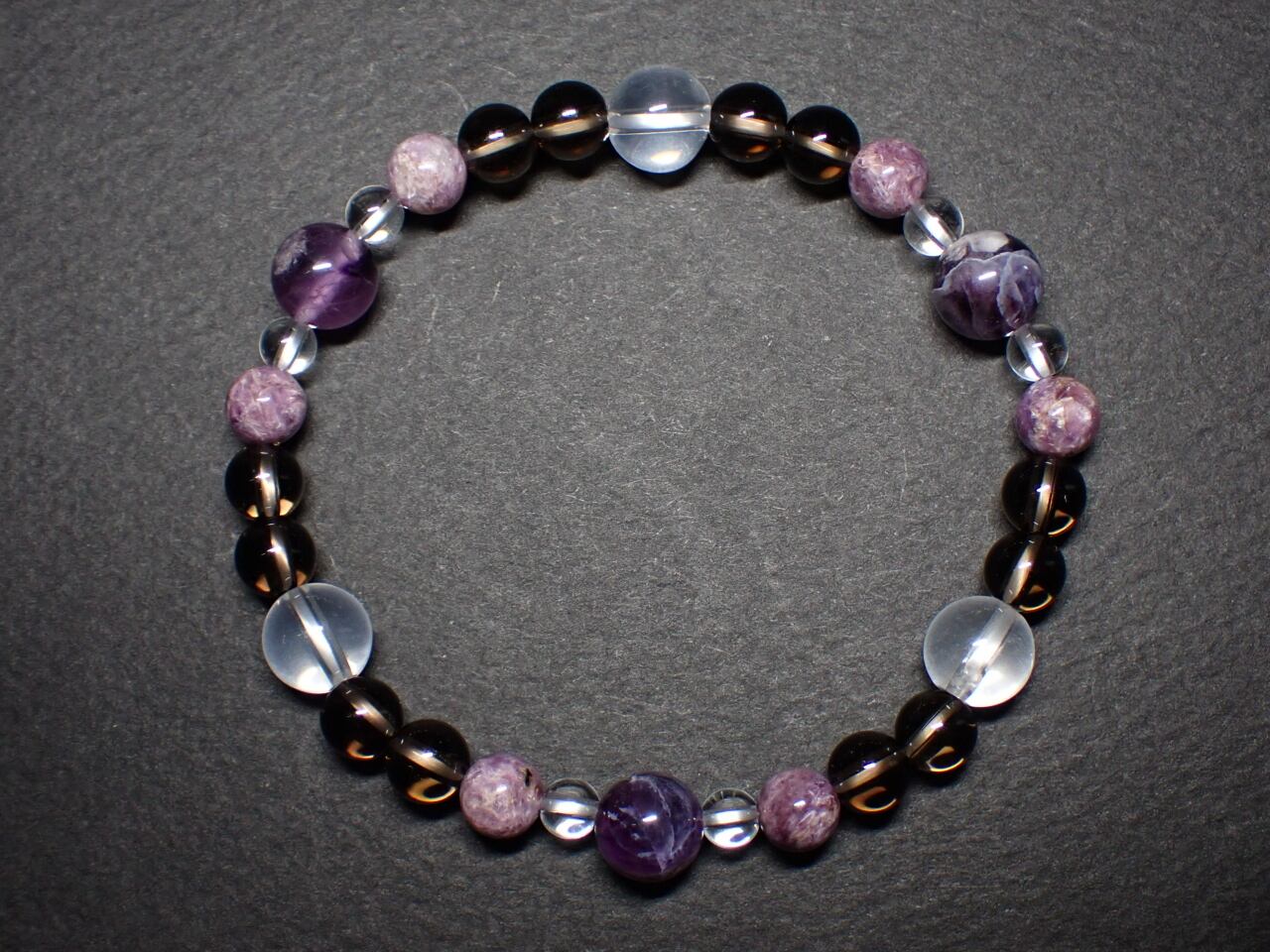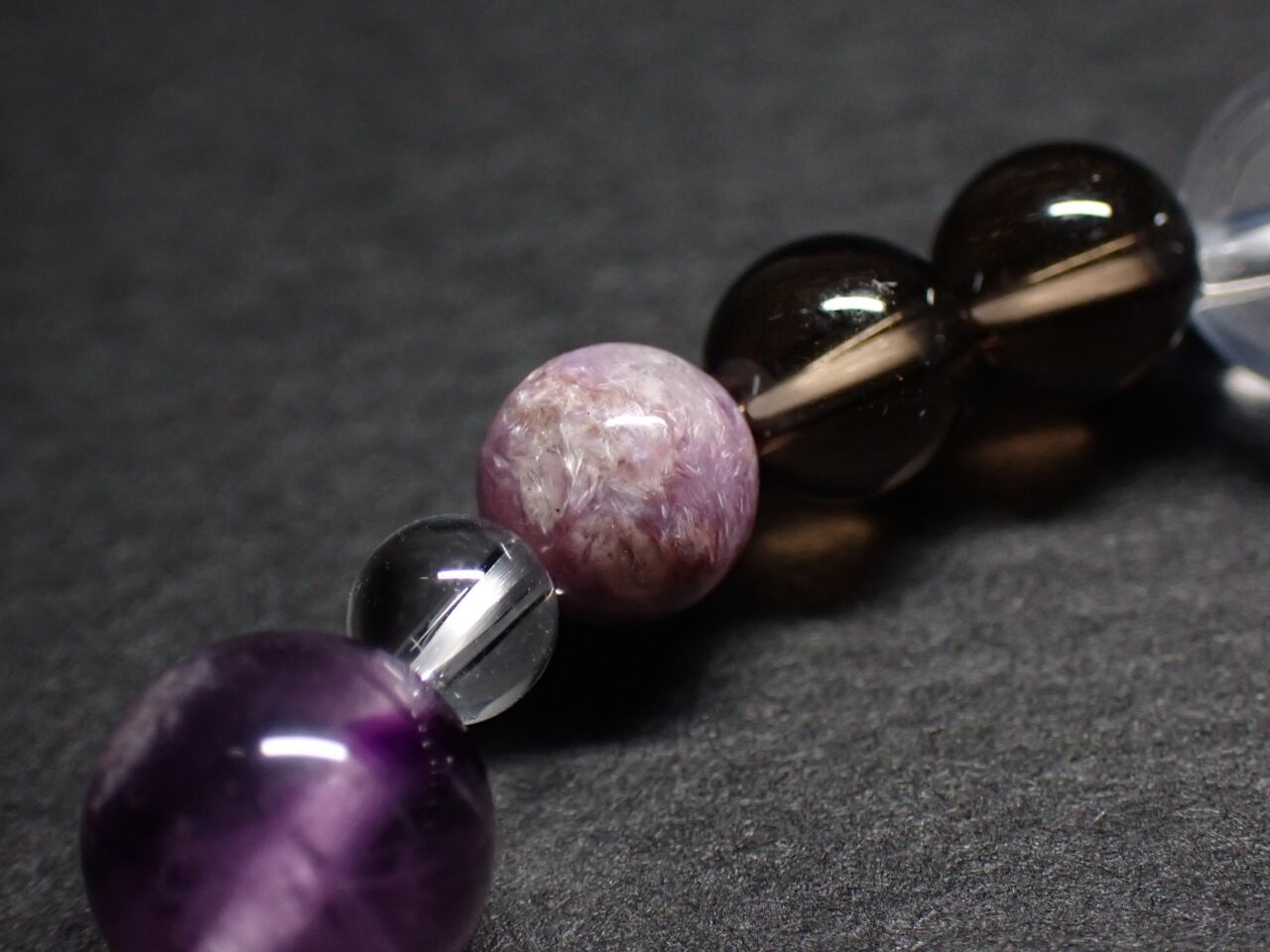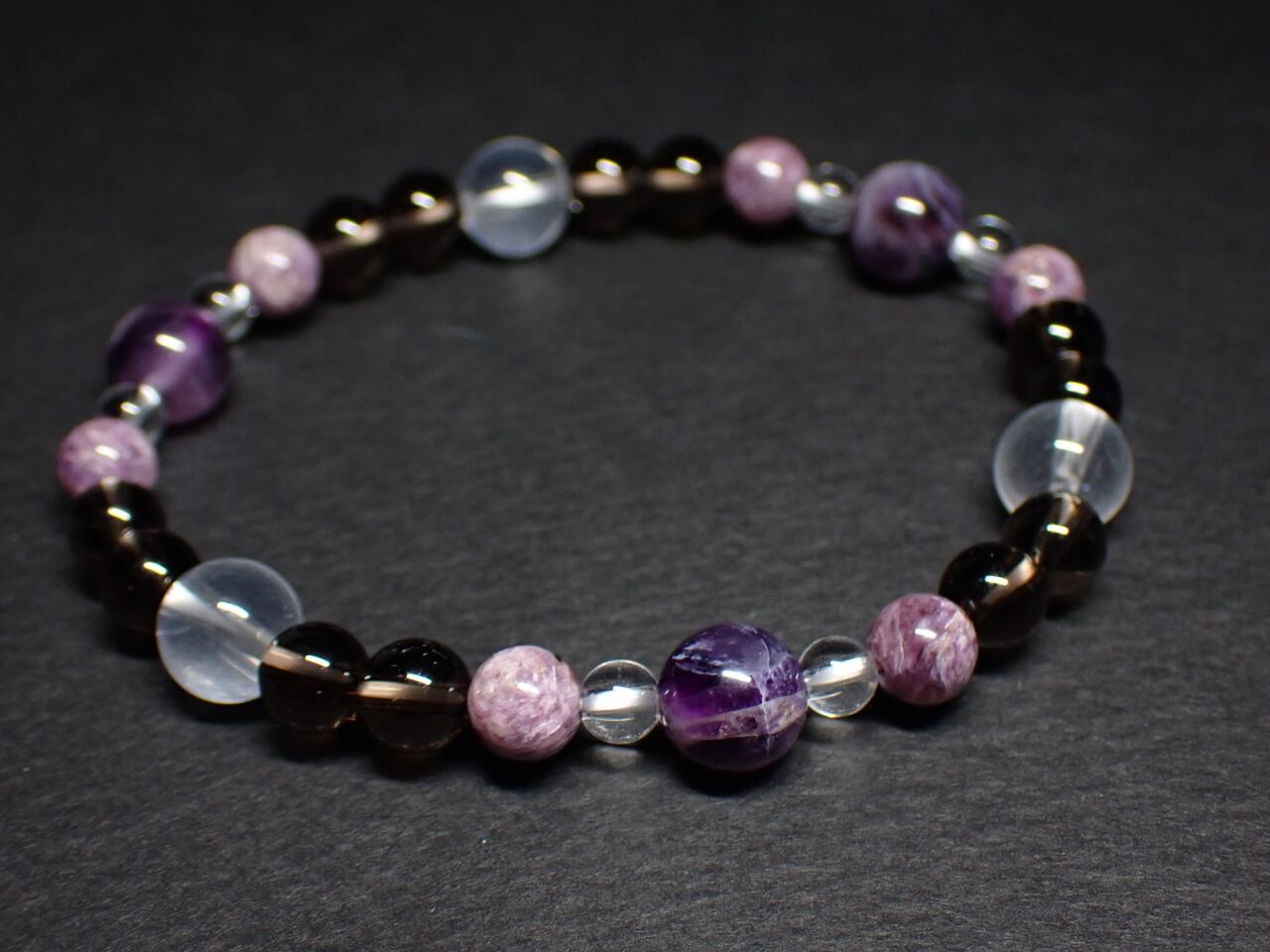 使用天然石…アメジスト8mmx3個 ミルキークォーツ8mmx3個 スモーキークォーツ6mmx12個 チャロアイト6mmx6個 水晶4mmx6個