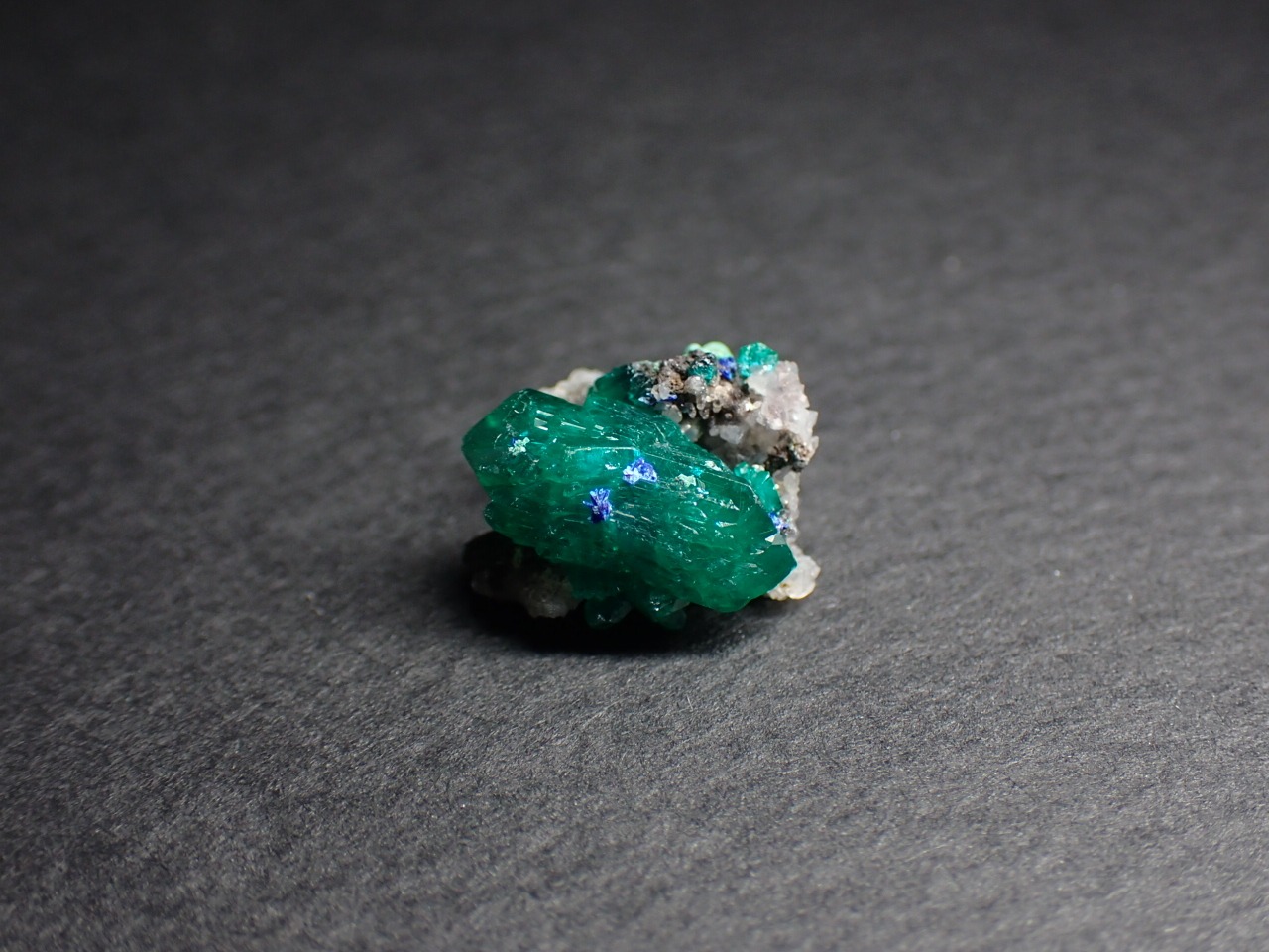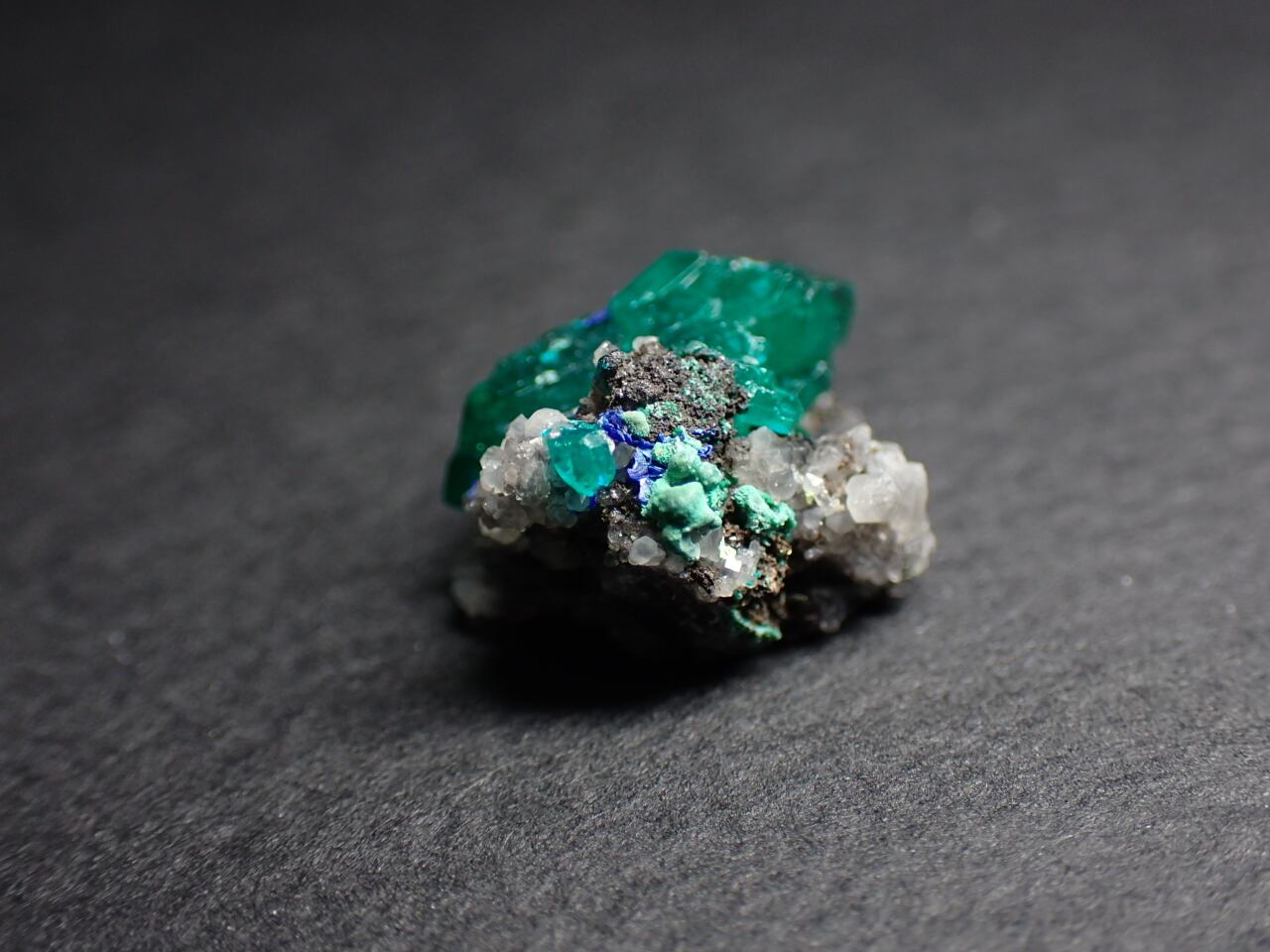 青い鉱物は恐らくアズライト(藍銅鉱)またはシャタッカイト(シャタック石)です。