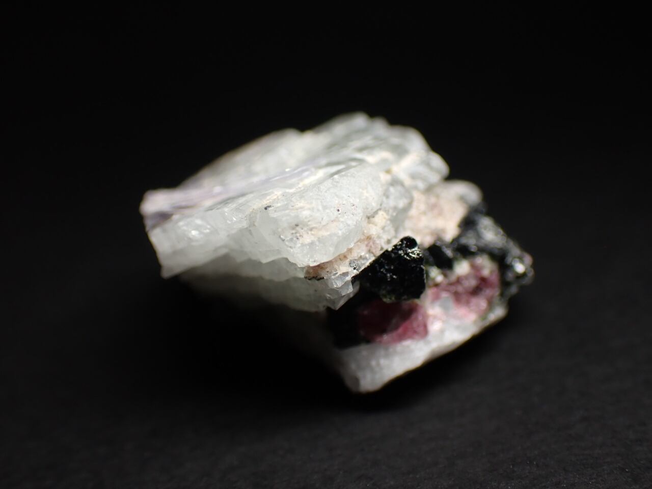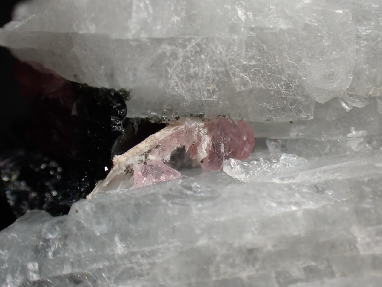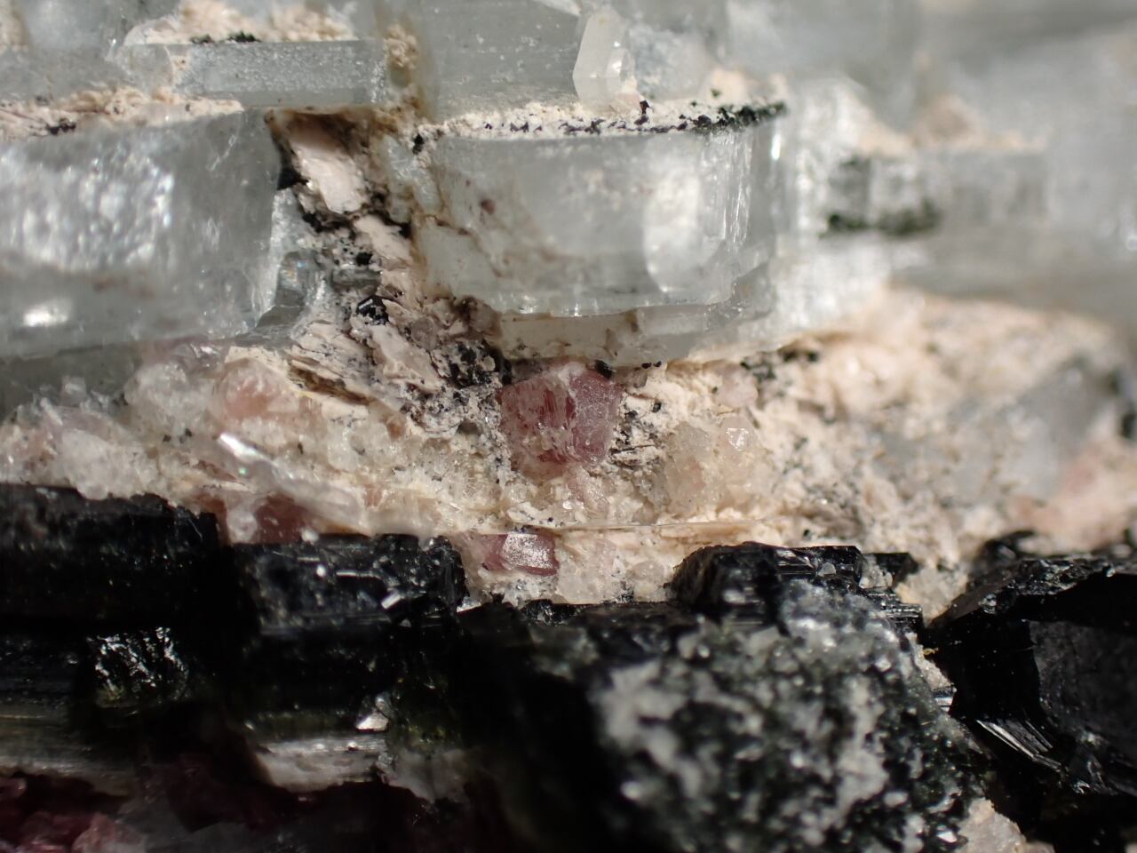小さなピンク色の結晶がペツォッタイト、薄い紫色の鉱物がレピドライト、黒い鉱物がショール、濃いめのピンク色の鉱物がエルバイトです。