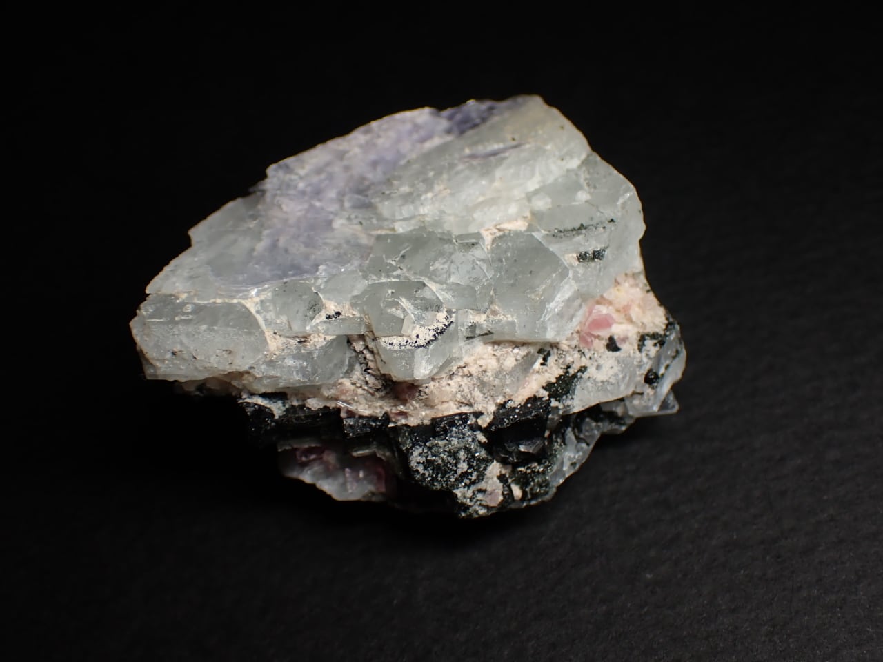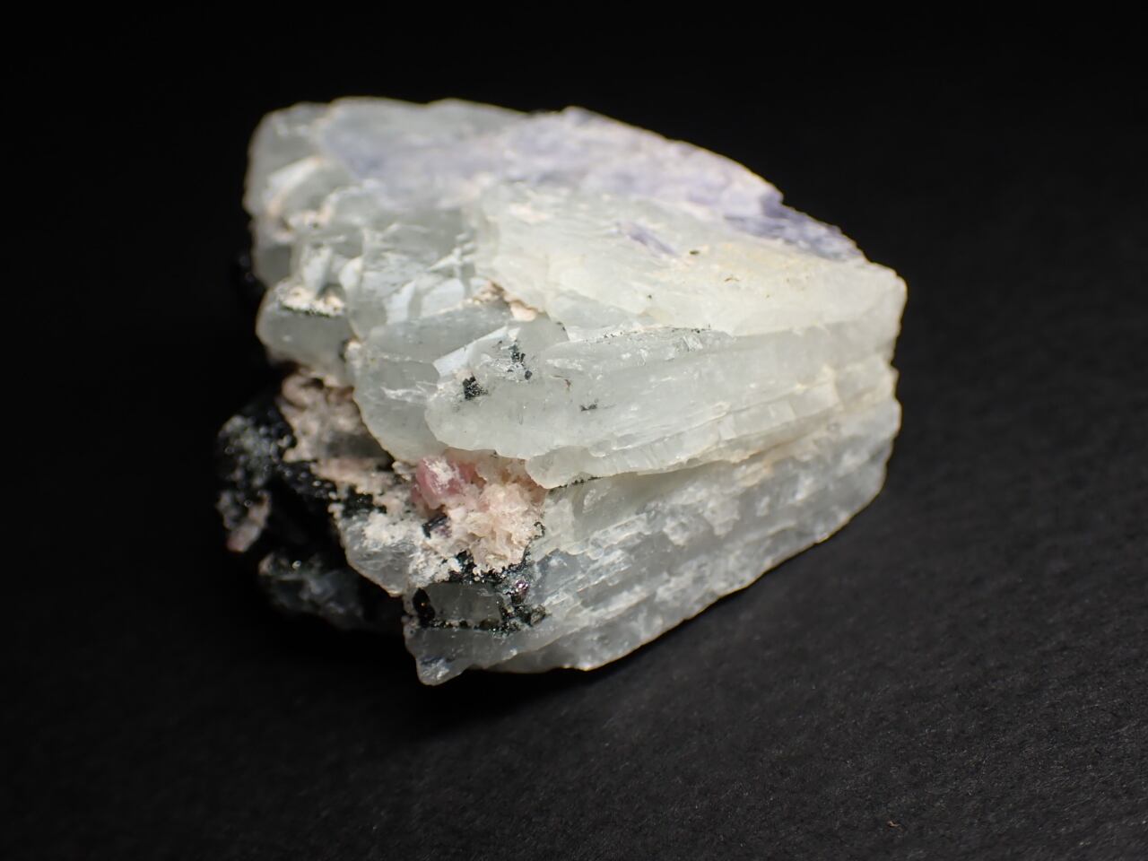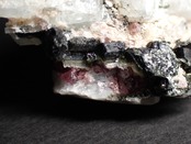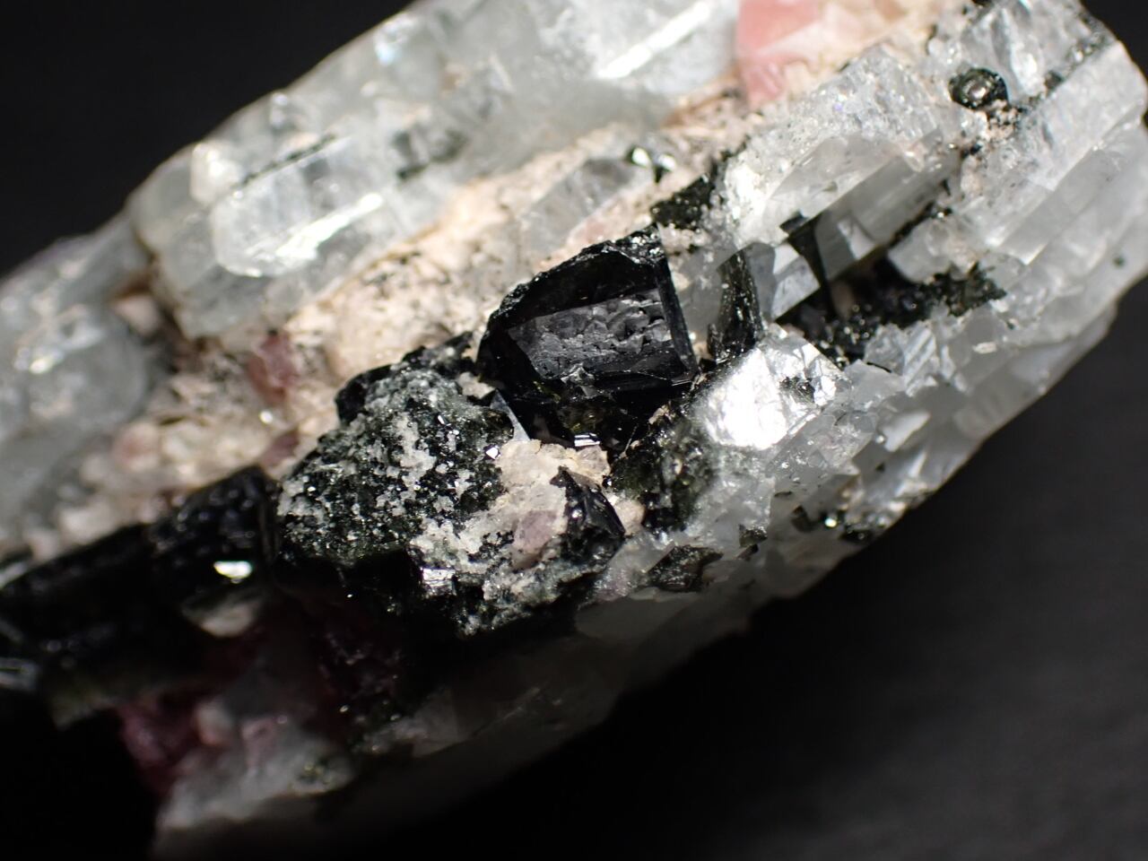 小さなピンク色の結晶がペツォッタイト、薄い紫色の鉱物がレピドライト、黒い鉱物がショール、濃いめのピンク色の鉱物がエルバイトです。