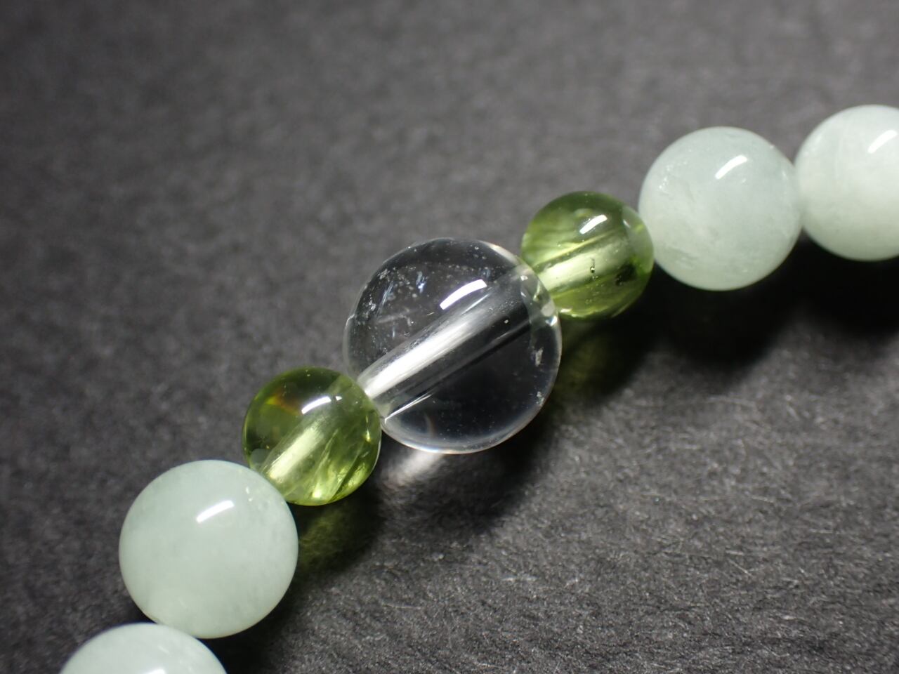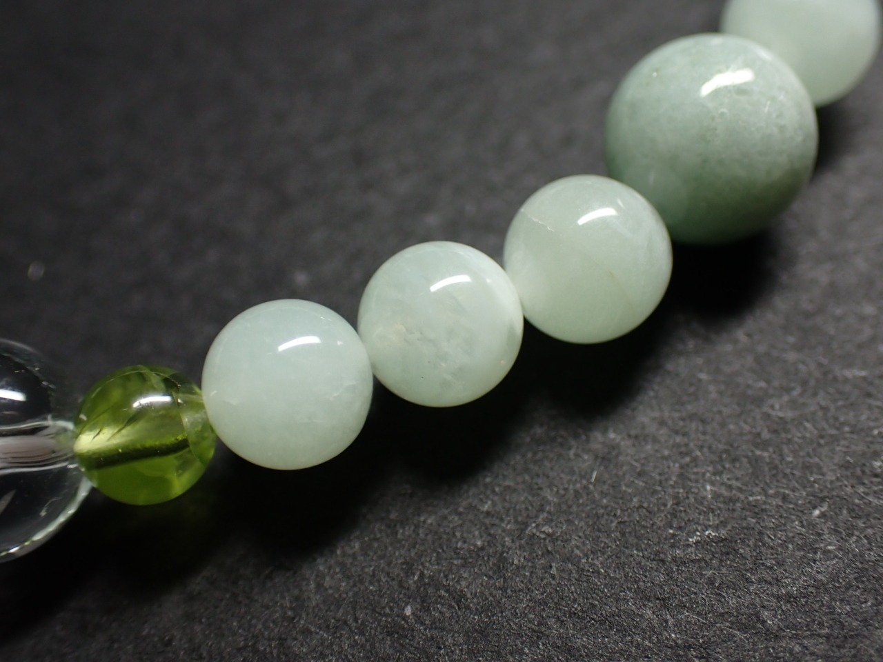 使用天然石…水晶8mmx3個 ビルマ翡翠8mmx3個 グリーンフェルドスパー6mmx18個 ペリドット4mmx6個