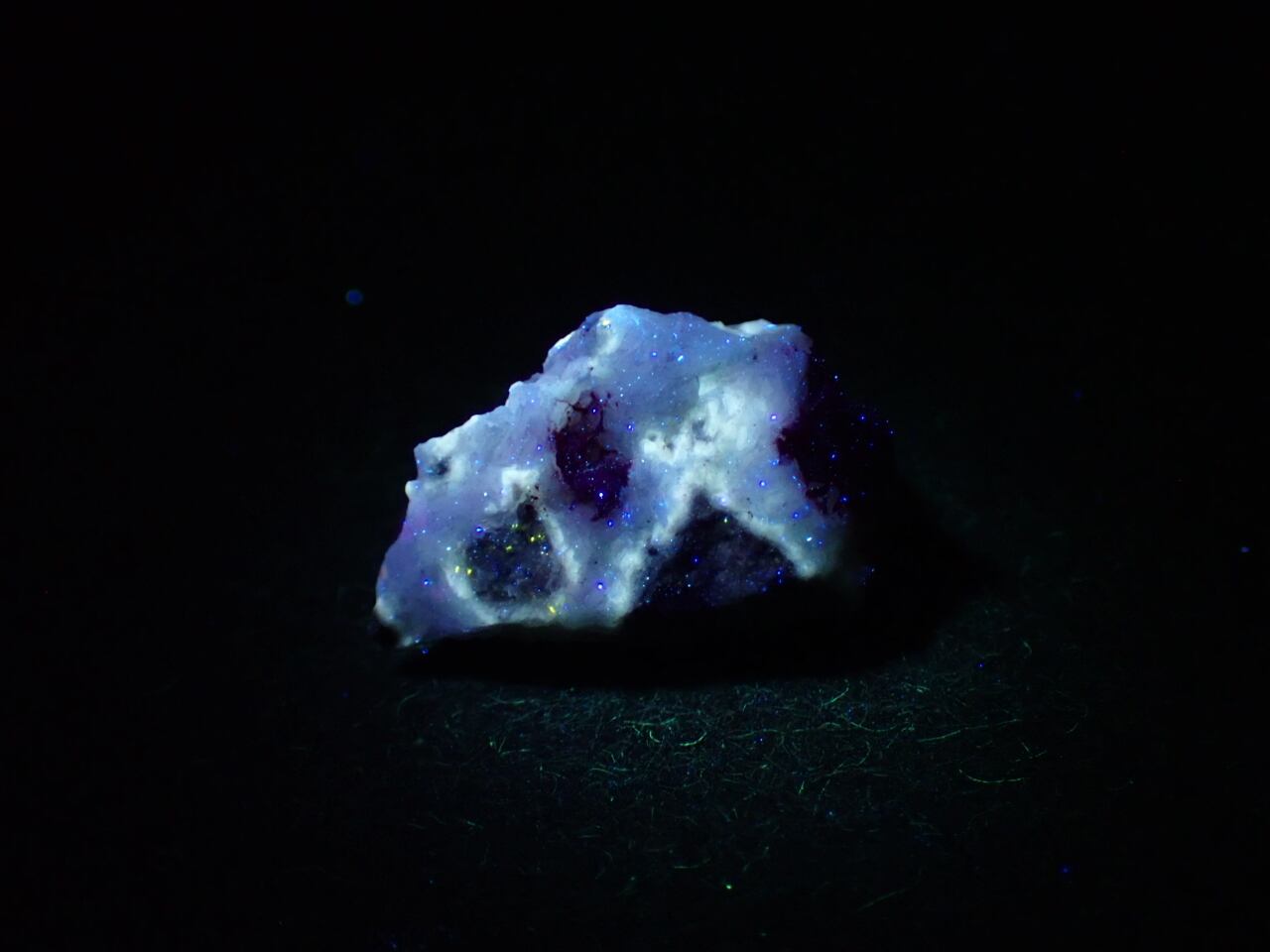 ハイパーUVライトで照らしたところ、黒い母岩とドロマイト(苦灰石)の間が蛍光しました。