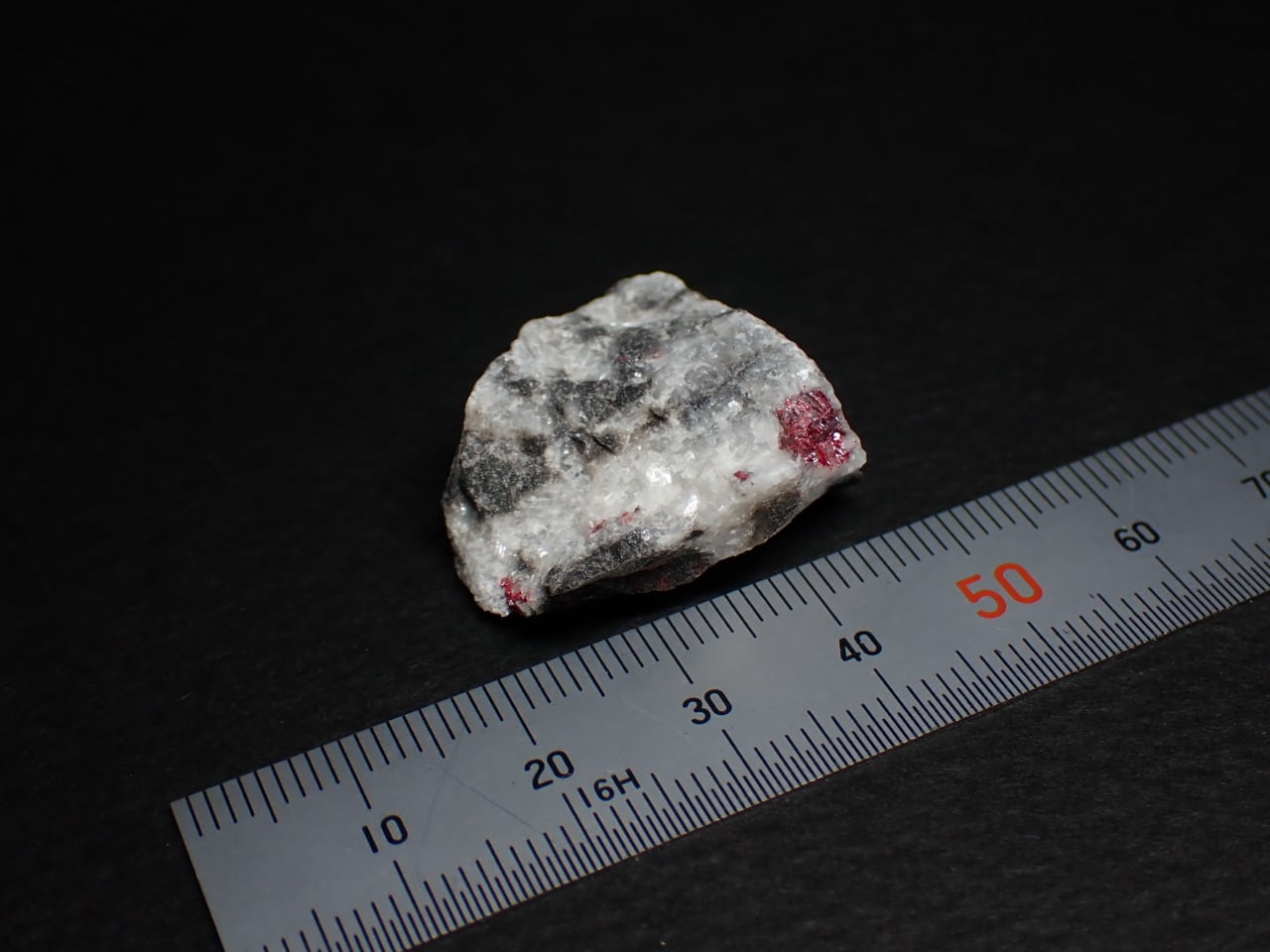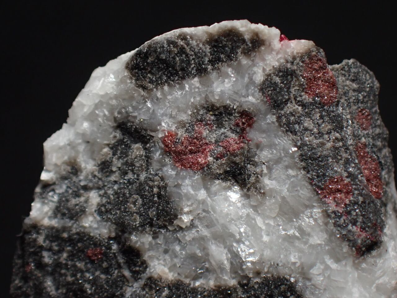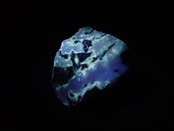 ハイパーUVライトで照らしたところ、黒い母岩とドロマイト(苦灰石)の間が蛍光しました。