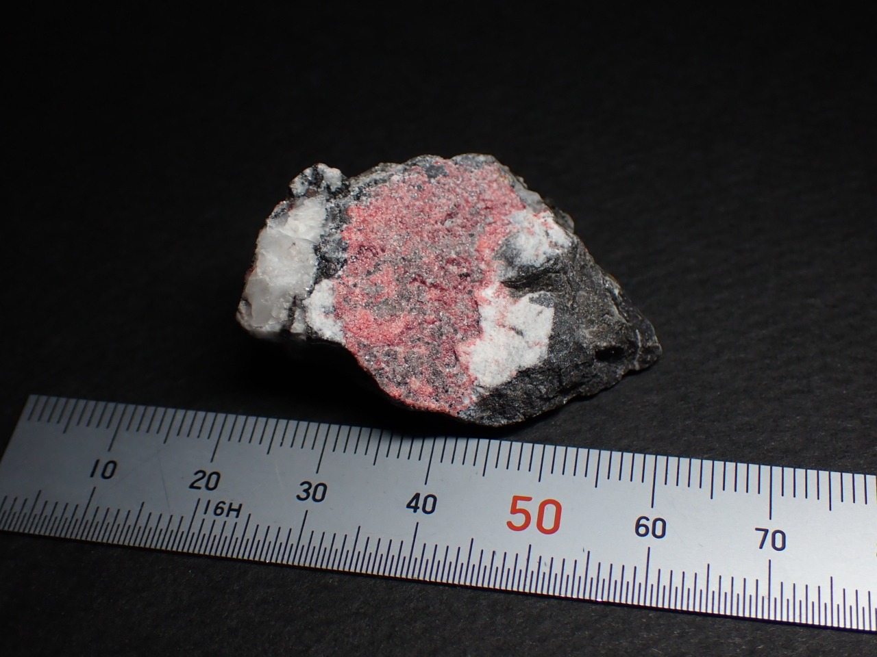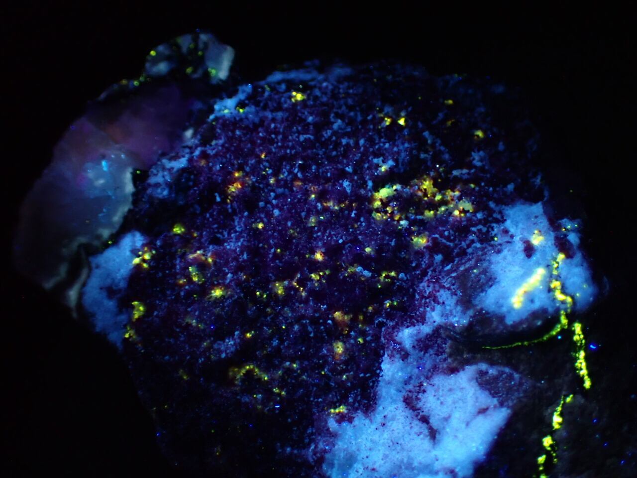 ハイパーUVライトで照らしたところ、黒い母岩とドロマイト(苦灰石)の間の蛍光の他に黄緑色の蛍光を示す箇所がありました。