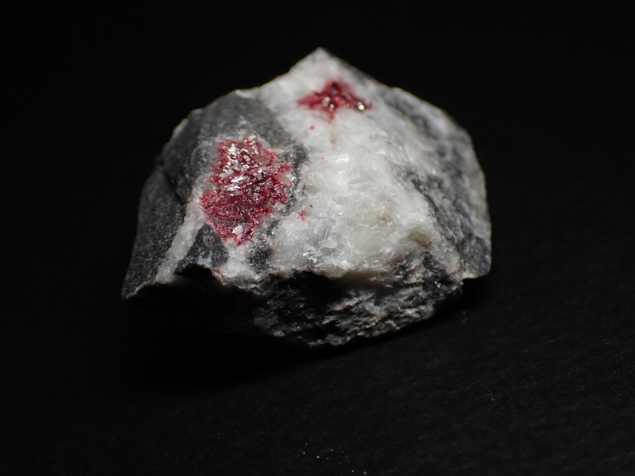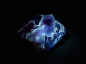 ハイパーUVライトで照らしたところ、黒い母岩とドロマイト(苦灰石)の間が蛍光しました。